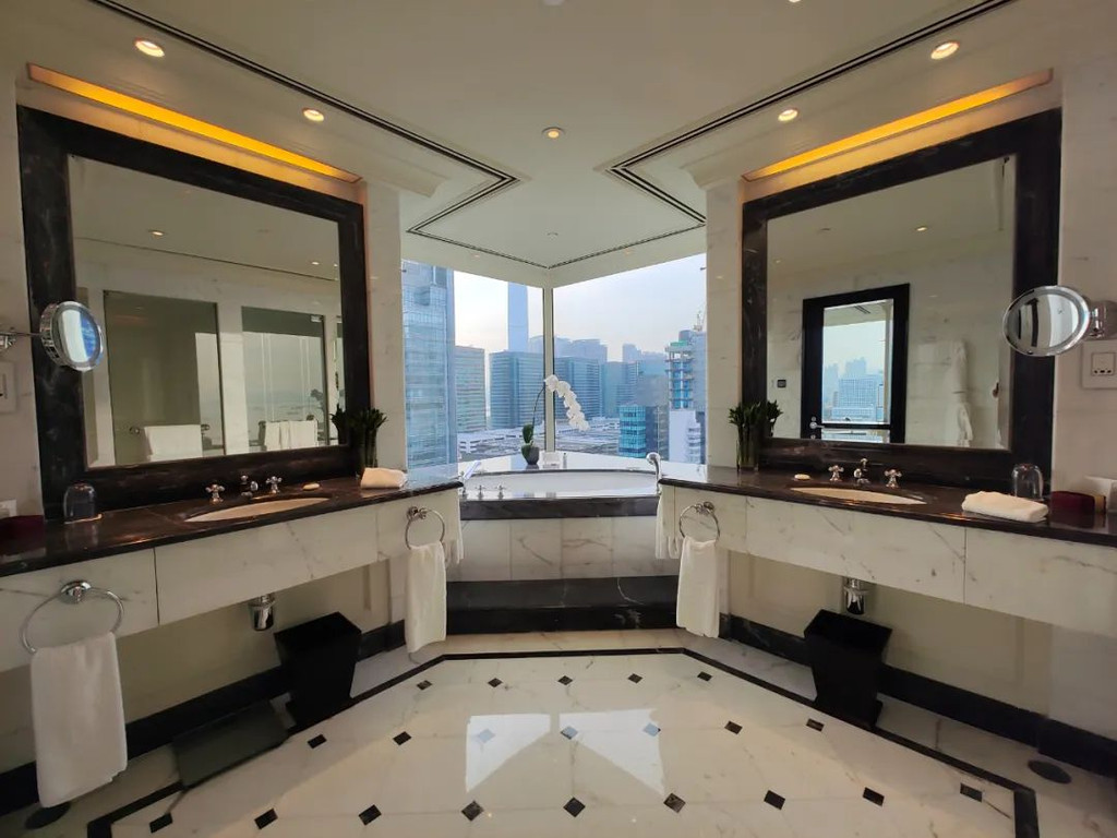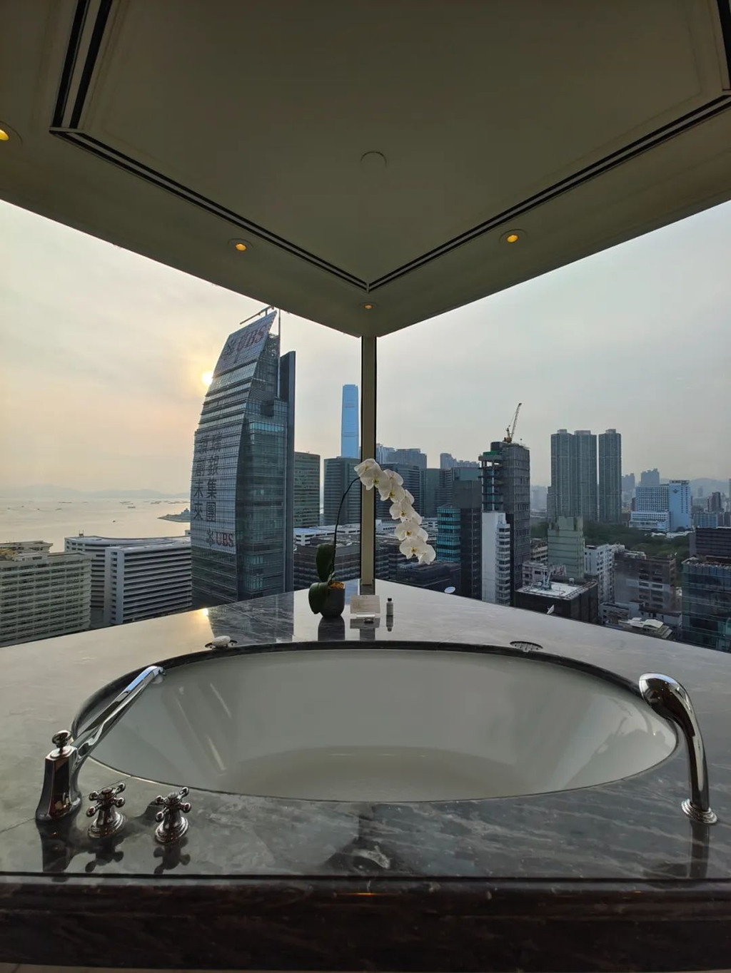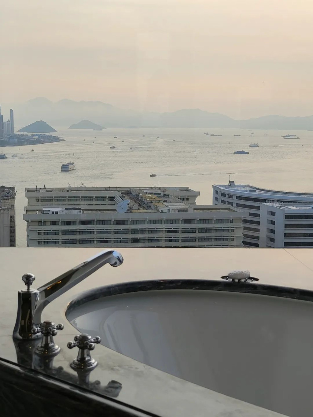 落日时分,躺在浴缸中,一边看夕阳下的东方明珠海景,一边看繁华都市的高楼街巷,这就很“半岛”。