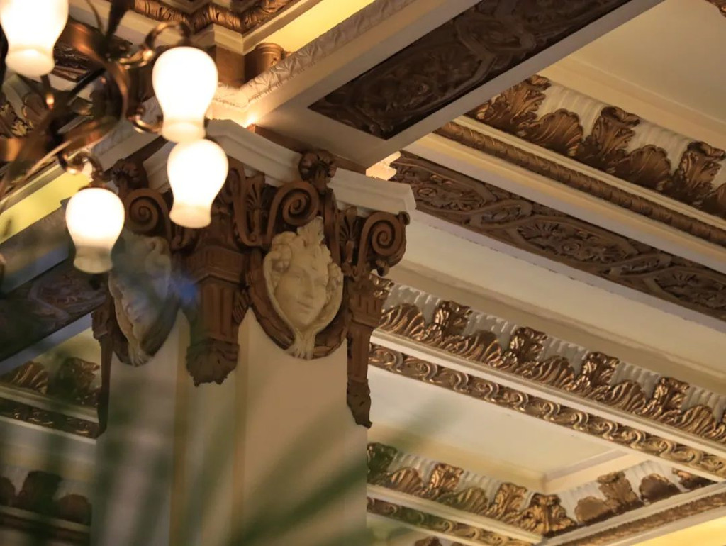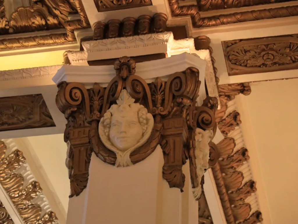 步入大堂,阳光从四扇巨大的拱形窗户透进室内,满目所及都是巴洛克建筑的华贵、繁复,15根巨型立柱上的76个众神面谱雕刻石像灵感源自古希腊神话传说的,每个都是独一无二。