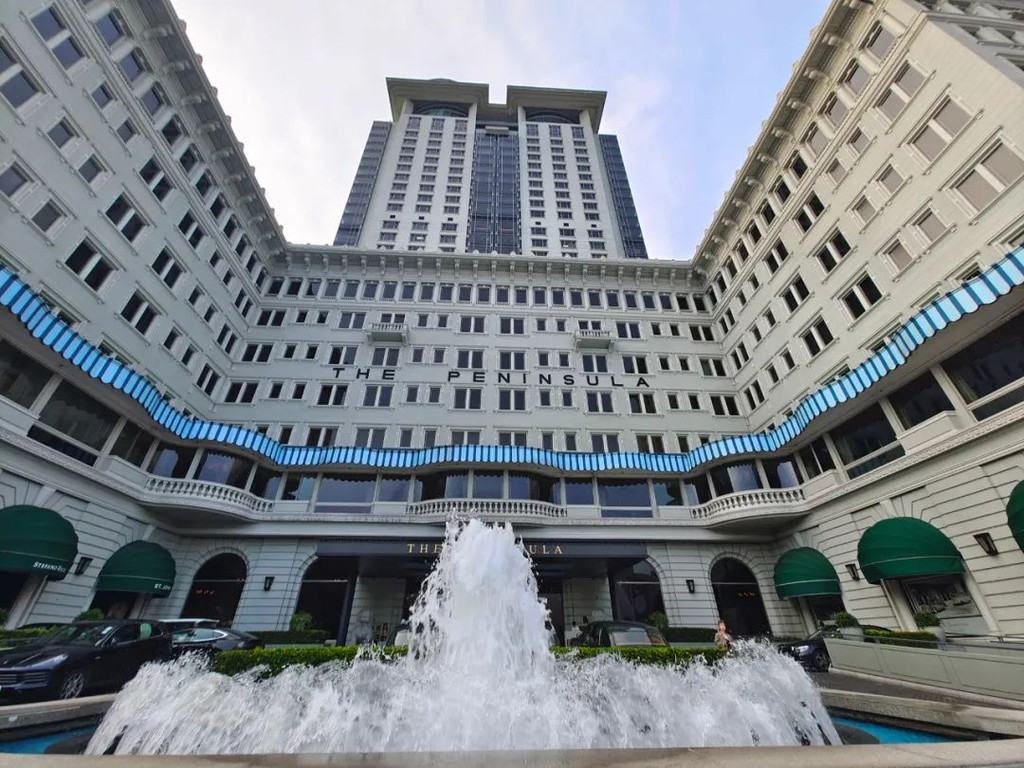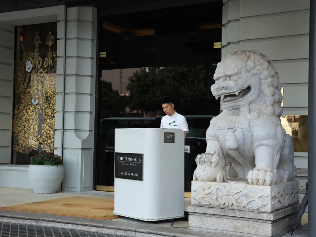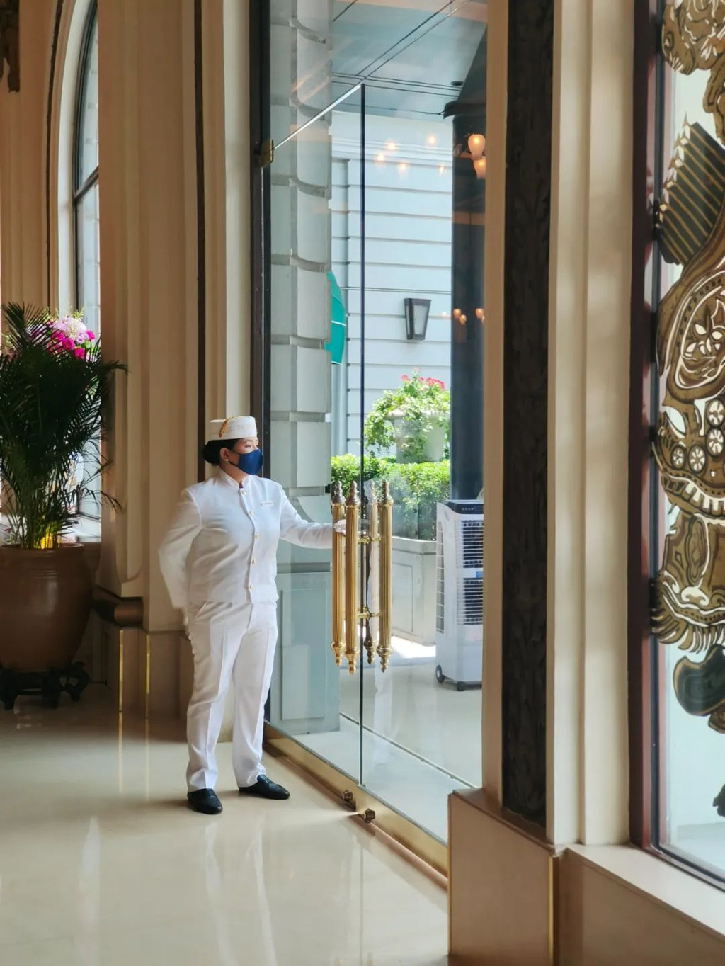 酒店整体建筑宏伟非凡,大门外的石狮子雕像、玻璃大门上印着的中式门神图案将中国风毫不生涩地展现着。酒店从开业至今一直保留着由门童(Page Boy)为每位客人开门、点头屈身迎客的老派贵族式服务,让宾客从到达第一刻起就有尊贵的感受。门童纯白制服和白色药盒帽由开业延用至今,并于全球所有半岛酒店内保持一致。