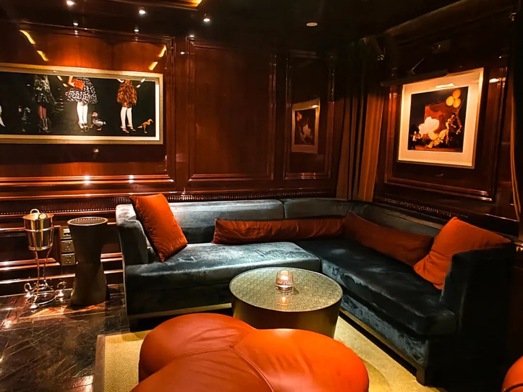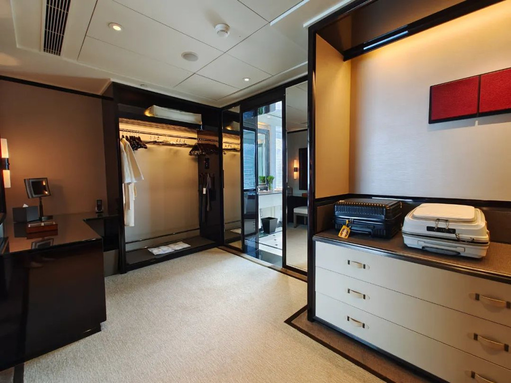 衣帽间及墙身的皮革板面、从古董行李箱取材的抽屉手挽、光亮的瘿木家具、趟门、座椅及沙发布置,全属匠心细节。