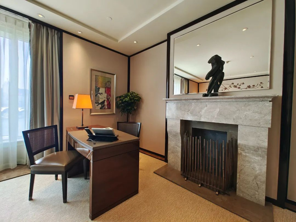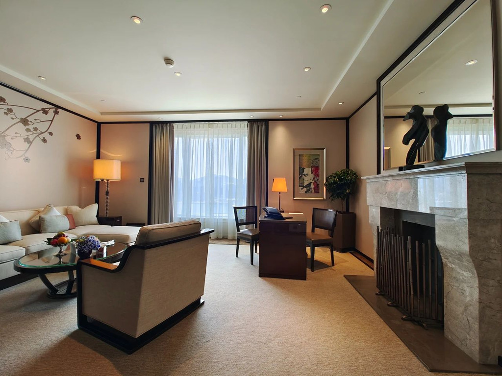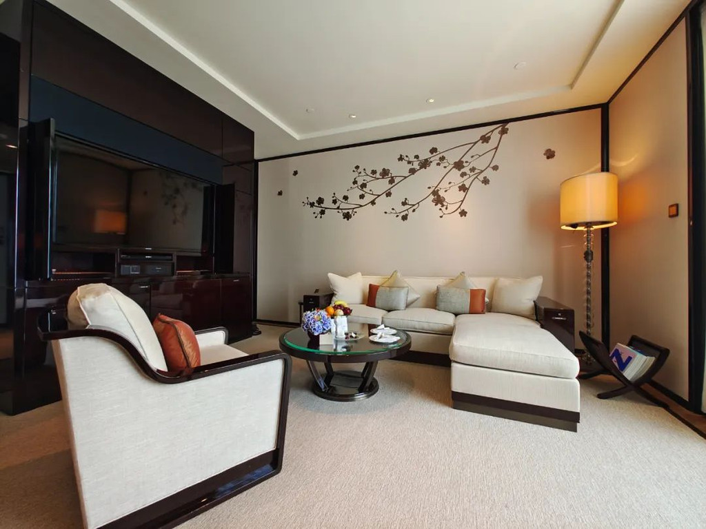 房间内的艺术设置众多,从香港艺术家设计的桃花主题墙,到哑面桃花心木餐桌、Cassina订造沙发及Poltrona Frau餐椅与扶手椅,雅奢感和实用性的平衡恰到好处。