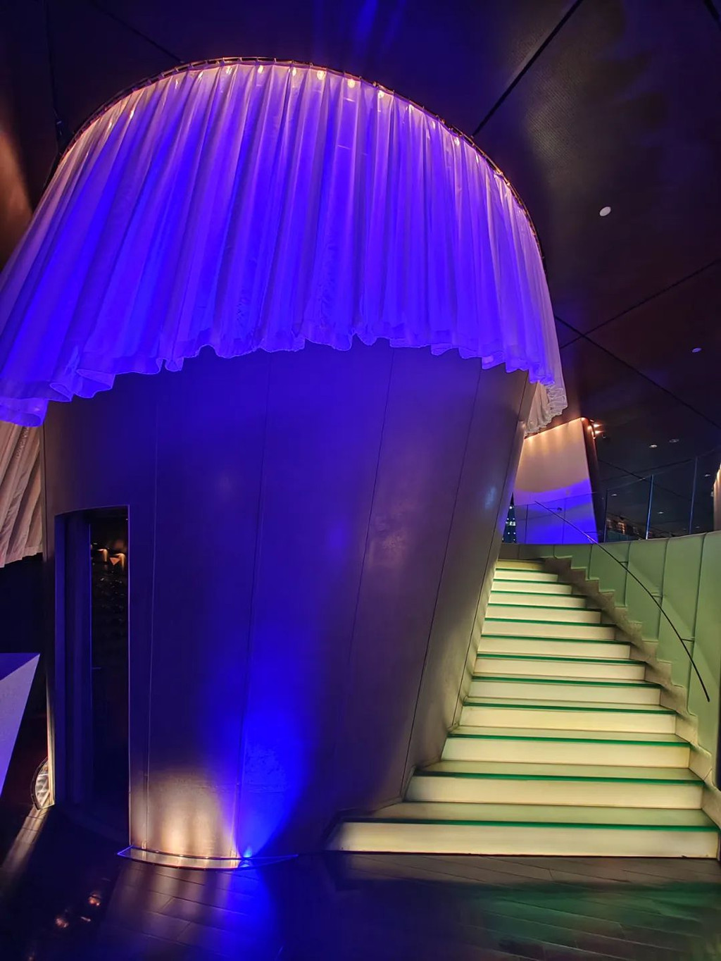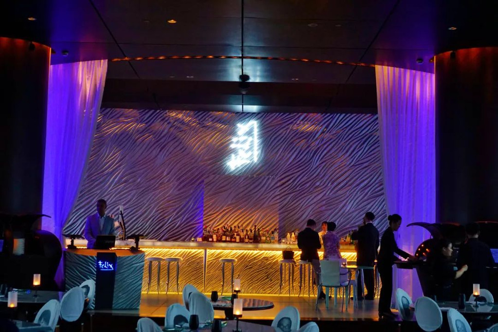 从专属电梯可以去到28楼Felix餐厅,进去电梯那一刻就感受到国际时尚餐酒吧的氛围,整个电梯充满欢快的音乐,关门之后随着电梯上升灯光也慢慢暗下来。出电梯后,经过一条如同T台般的红地毯长廊,经过wine bar、balcony、crazy box、American bar,就正式进入Felix时尚的太空舱空间。