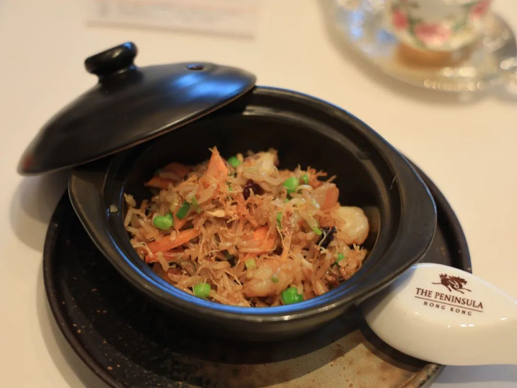 当日的菜单中,两位花花都点赞的是砂锅嘉麟楼极品炒饭,据掌厨超过二十年的嘉麟楼行政主厨林钰明师傅介绍,这道炒饭一共用十三、四种配料,包括烧鹅粒、带子粒、鲜虾粒、鲜蟹肉等,单是瑶柱,也分干瑶柱及炸瑶柱,每种食材各司其职,落料先后亦有讲究,所以每一口炒饭的味道层次都特别丰富、都有变化。