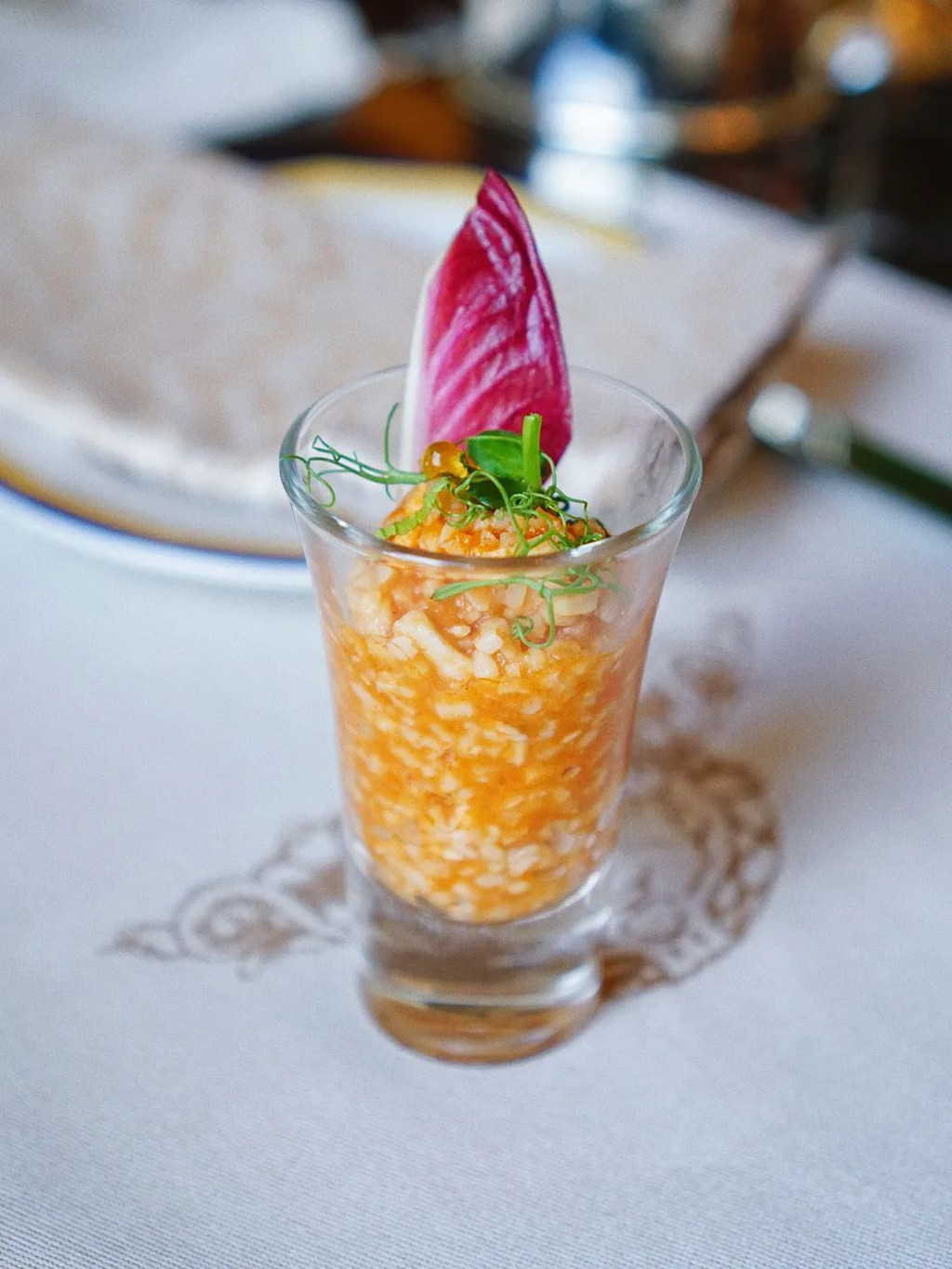 整个餐厅设计前卫又梦幻,各分区有不少细节处特别有个性,其中,餐厅的餐椅设计为“名人堂”——椅背上印的都是为酒店长期服务的员工的头像照片,除了有Felix M Bieger先生,还有已服务酒店超50年的酒吧调酒师Johnny,话说当年《乱世佳人》主演克拉克·盖博(Clark Gable)到酒店点一款The screwdriver,Johnny真的给他上了一支螺丝刀,自此The screwdriver也成了香港半岛最经典的鸡尾酒。