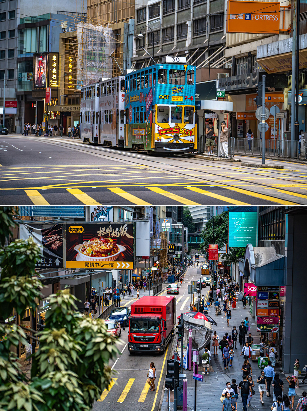 香港中环,往来的电车和熙攘的人群,是港剧和电影中出现最多的场景之一,铁轨发来的铛铛声仿佛带领我们穿越回那个年代,纸醉金迷光辉夺目的黄金时代。镜头里起伏上下自带怀旧复古感的中环街道真的太出片了。