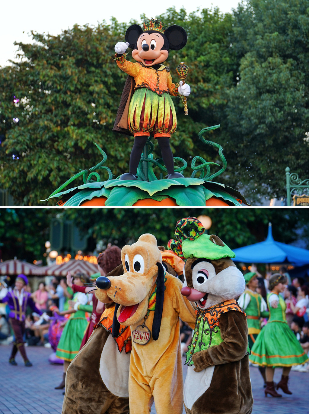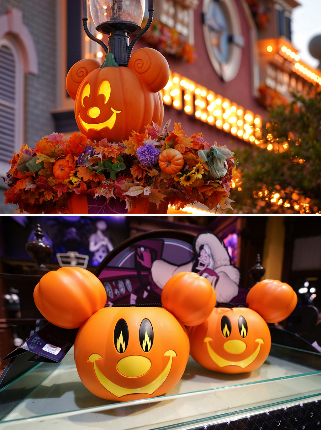 第一眼乐园气息确实不同,所有的路灯上都装设了米奇南瓜脑袋灯,装扮的植物配色也多由绿色和橙色来担当。