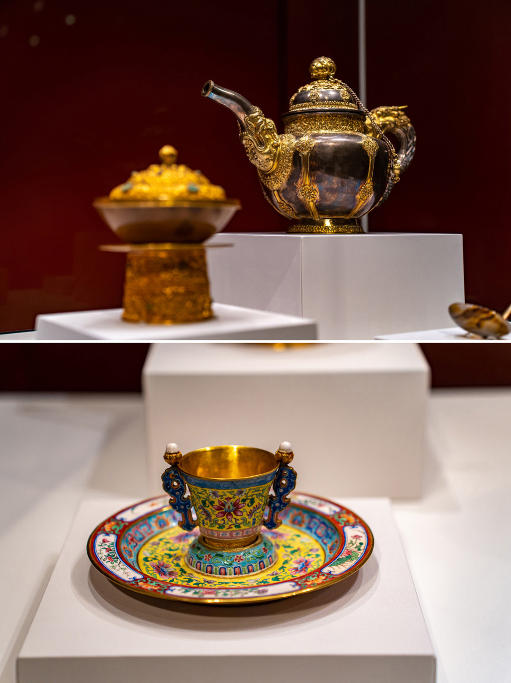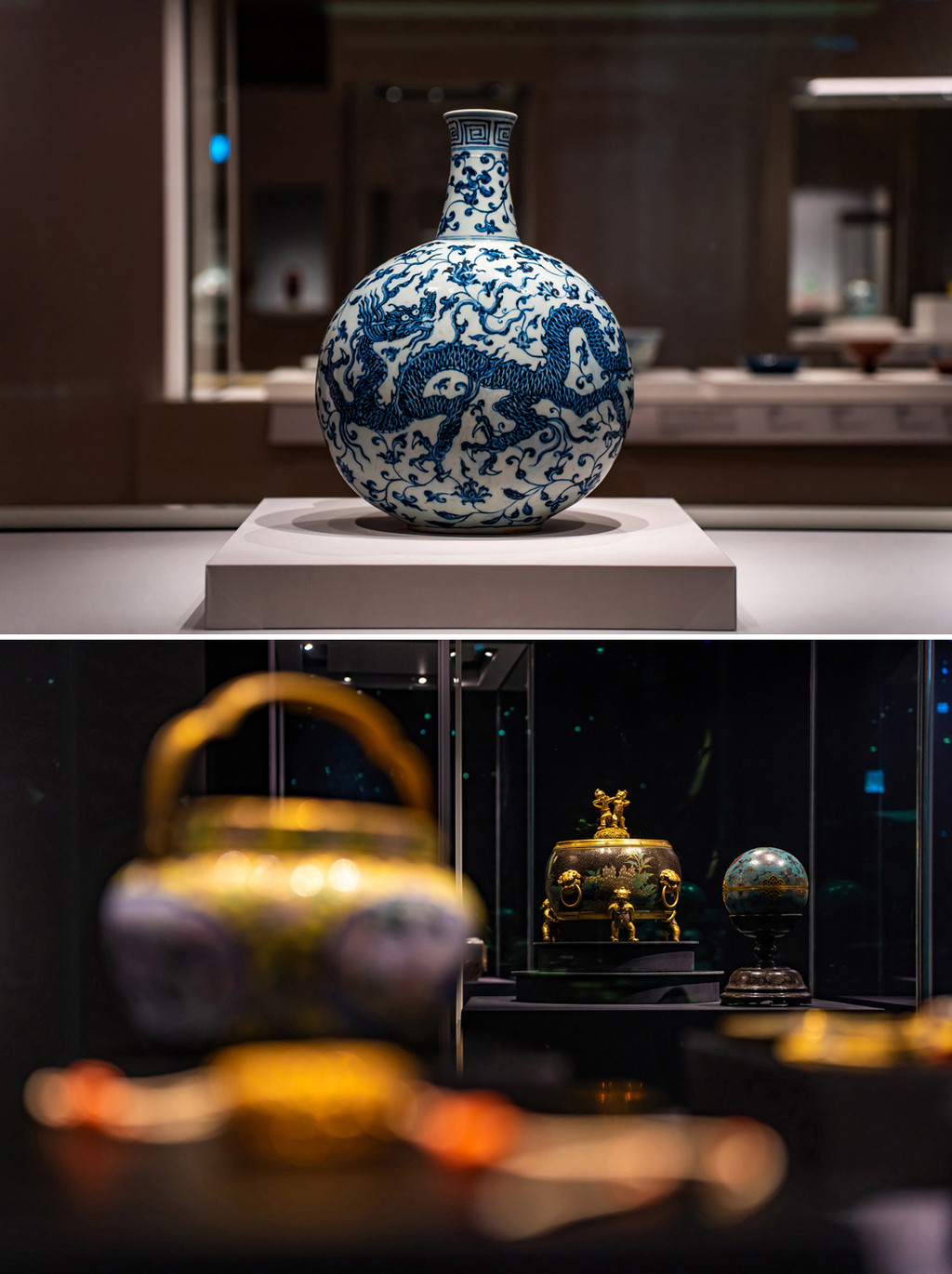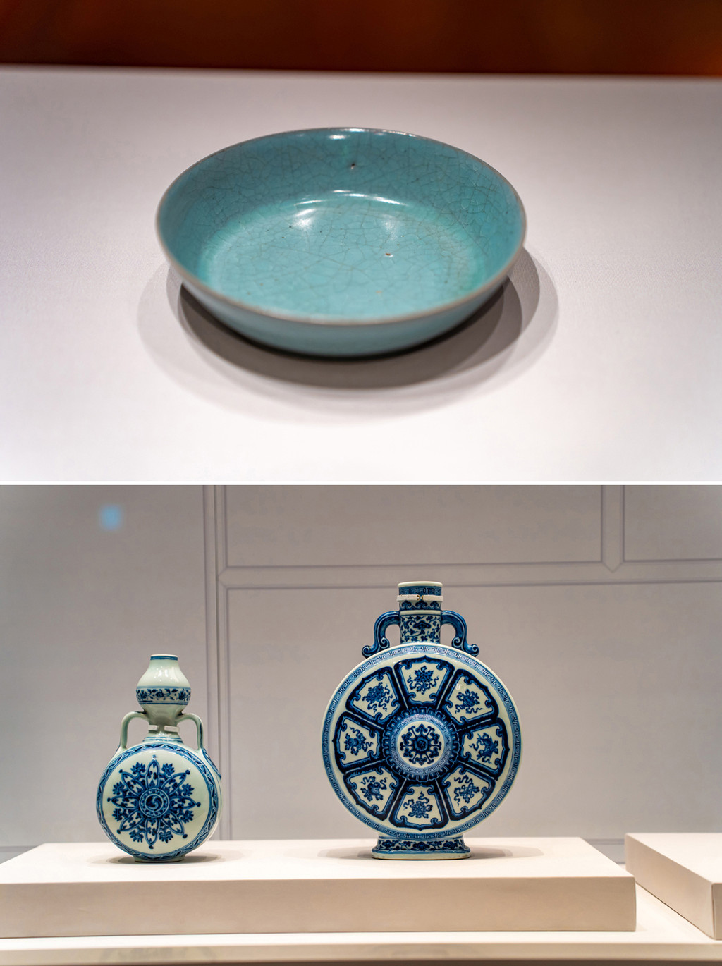 比如天青釉汝窑磁盘,可是价值动辄上亿元的珍宝。各种器型的青花瓷器,超高难度工艺的旋转纹玻璃瓶,和穿越千年而来的青铜器和羊脂玉器,各种金盘子金碗巧夺天工的文物数不胜数,确实大开眼界了。