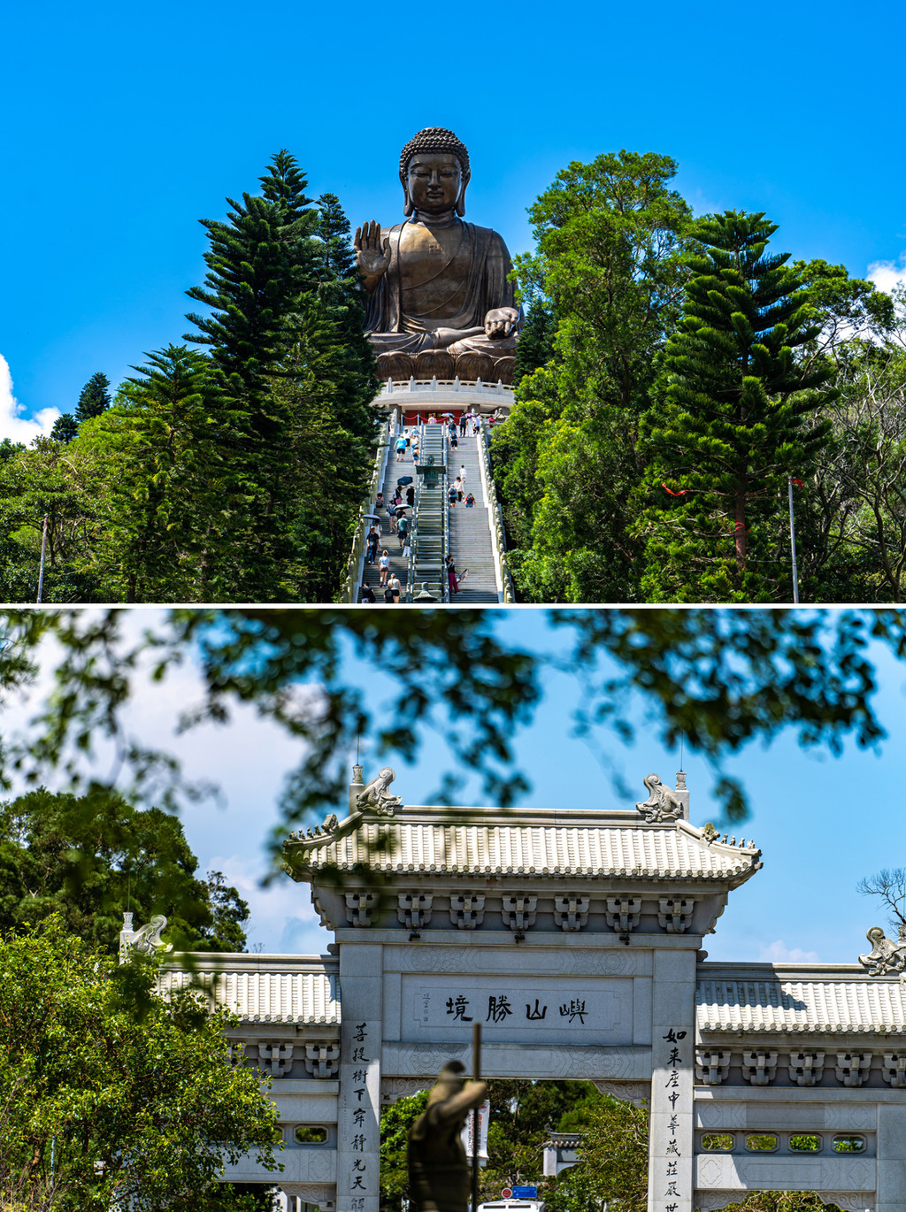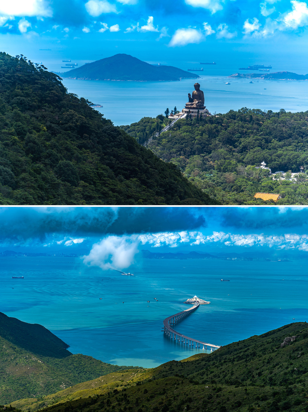 往远处看除了蔚蓝大海,还可以清楚的看到蜿蜒的港珠澳大桥,翻过一座山峰,立刻就能看到不远处山巅的大佛,依山傍海,真仙境感。