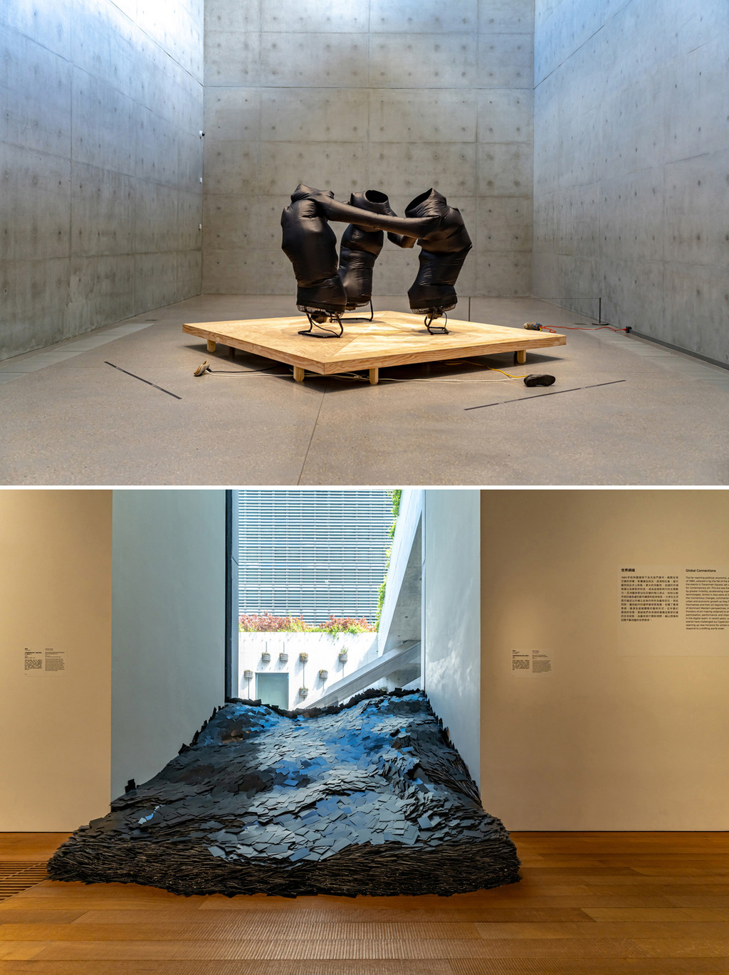 清水混凝土的建筑结构现代简约,直线与斜线的交叉构成给予展览最大的极简空间利用可能。偶尔出现的曲线和通透的窗外结构,整个展览馆的构造,都是我最爱的样子。