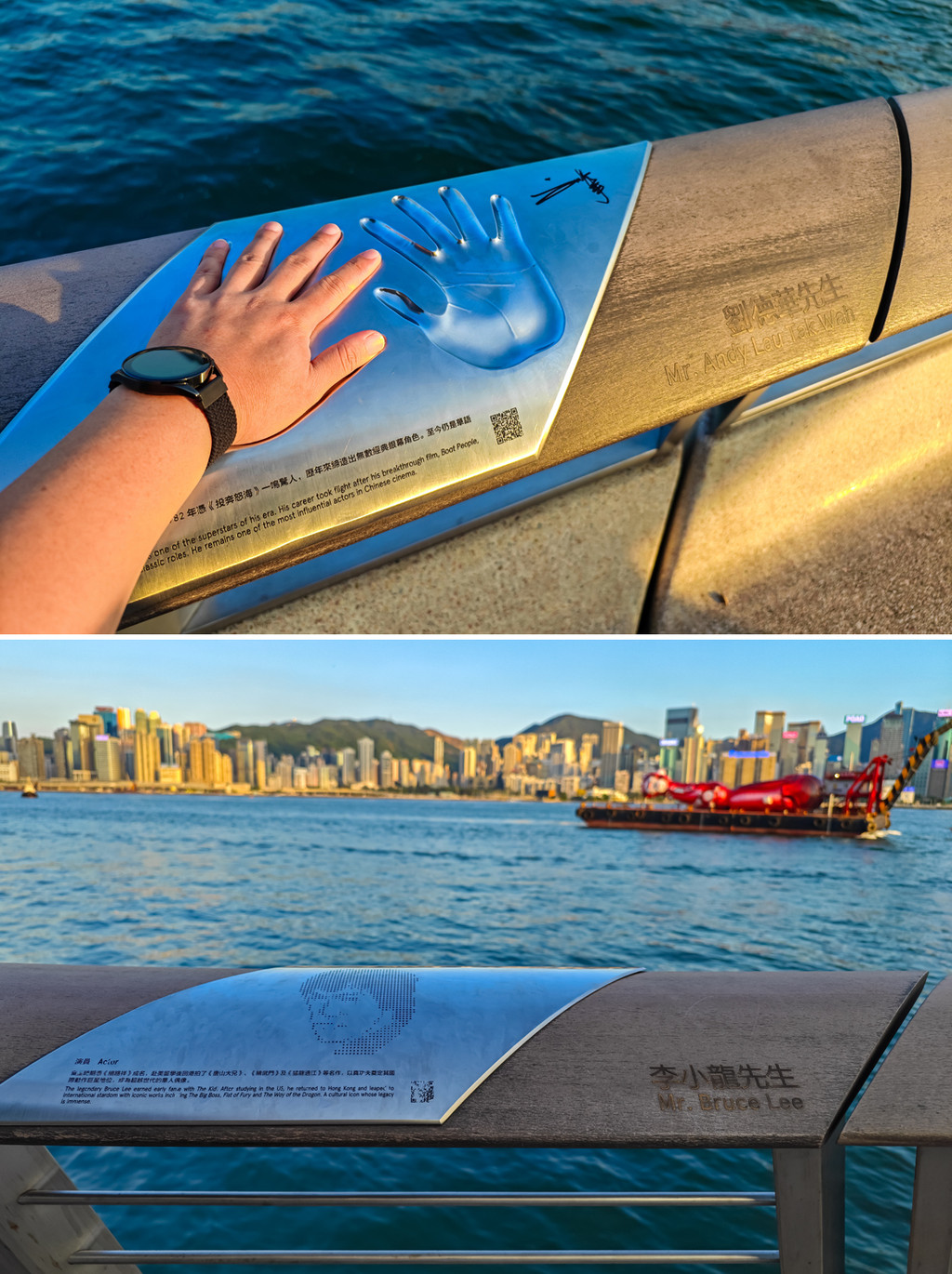 当然星光大道本身也足够精彩,在金像奖雕塑的引领之下,几乎所有香港著名演员导演在维港海湾的扶栏上留下珍贵的签名和掌印,所以称为“星光大道”,供来到香港的游人可以最近距离的追星一下,找到自己的偶像,手掌相合,以维港为背景,合影留念,真的就非常有意义了!