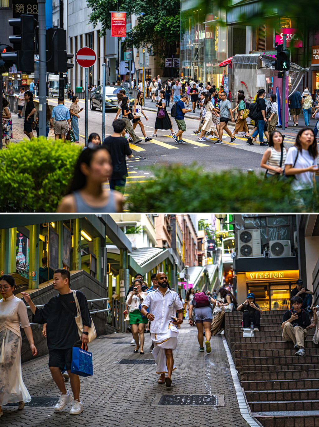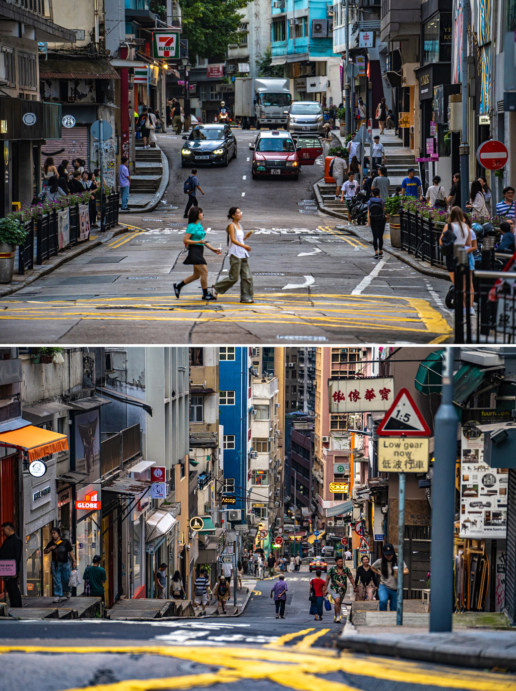 这里还有一条长长的坡道,向城市的深处延展,一眼望不到头,站在扶手电梯,缓慢爬升,两侧高楼中间是坡度更大的道路,近处的车,中间的商铺和上坡走过斑马线的行人层次叠加,神奇的出现在了一幅画面之中,这也是摄影师钟爱香港的原因之一,让构图和意境在眼前频频出现,稍加等待,也许就能收获一张城市大片。