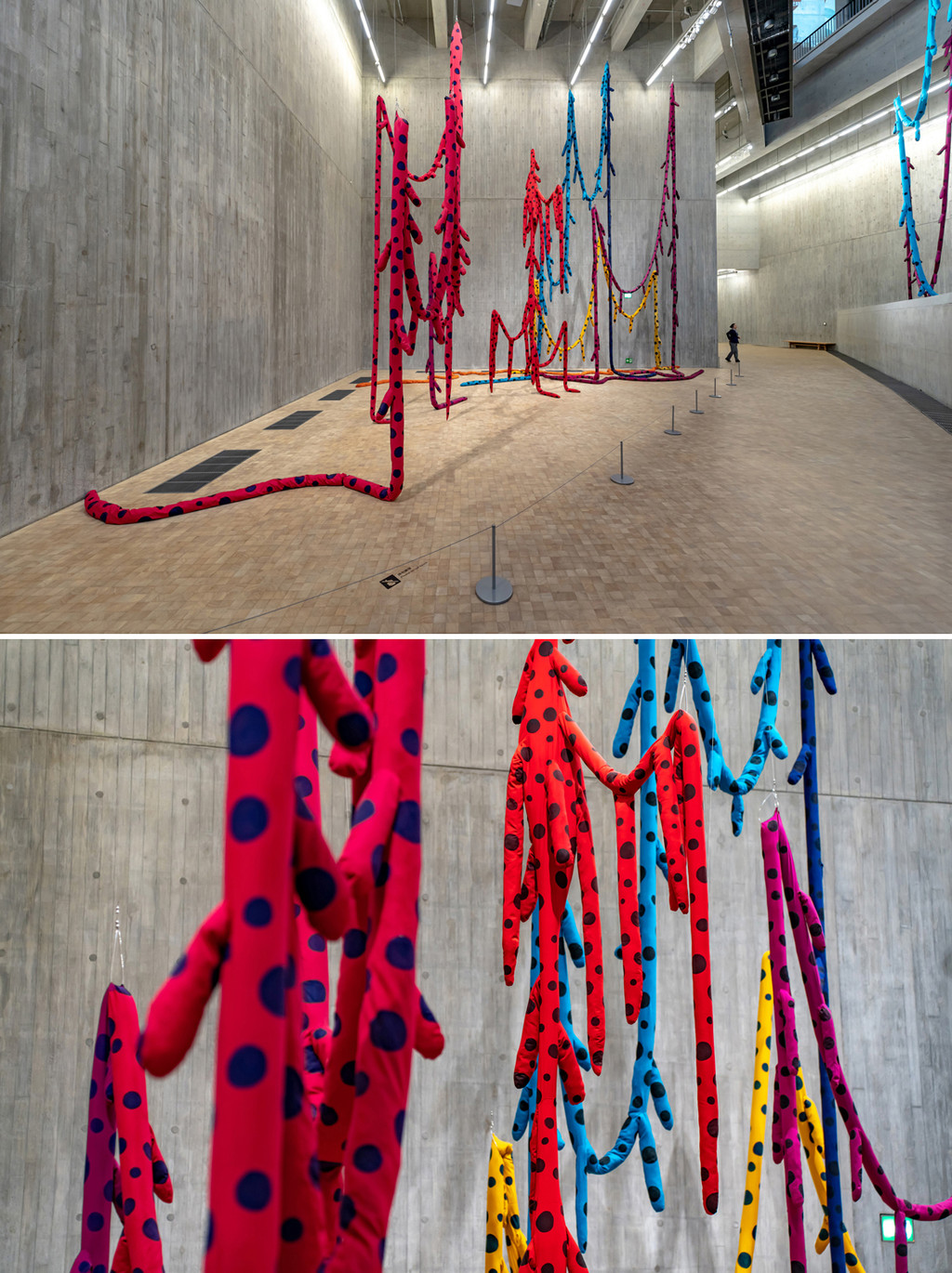 另外一处是位于走廊空间的彩色条状波点布艺装置,鲜艳的色彩和灰青的混凝土风格和硬度完全迥异的材质共处一室,这种反差感非常强烈,努力的尝试理解,最终还是理解不了,哈哈,但拍照还是好看的。