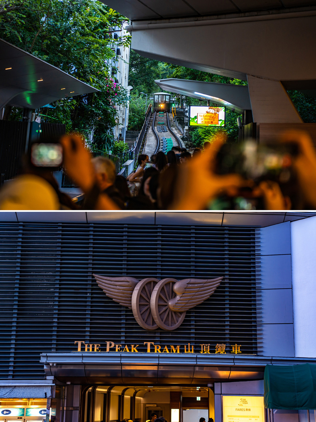 维多利亚港的夜景是全世界游客来香港都要打卡拍摄的存在,观赏和拍摄维多利亚港夜景有两个推荐位置,一个就是星光大道,另外一个就是太平山顶,从天星小轮码头出来乘车去往太平山缆车站,感受一下百年缆车的新样貌,现代感十足的缆车站换装了新型的缆车轿厢,一边下客一边上客井然有序,建议大家早点上山,在落日之前,因为每天在山顶观景拍照的人都很多,提前去占据一个有利的位置是关键中的关键。