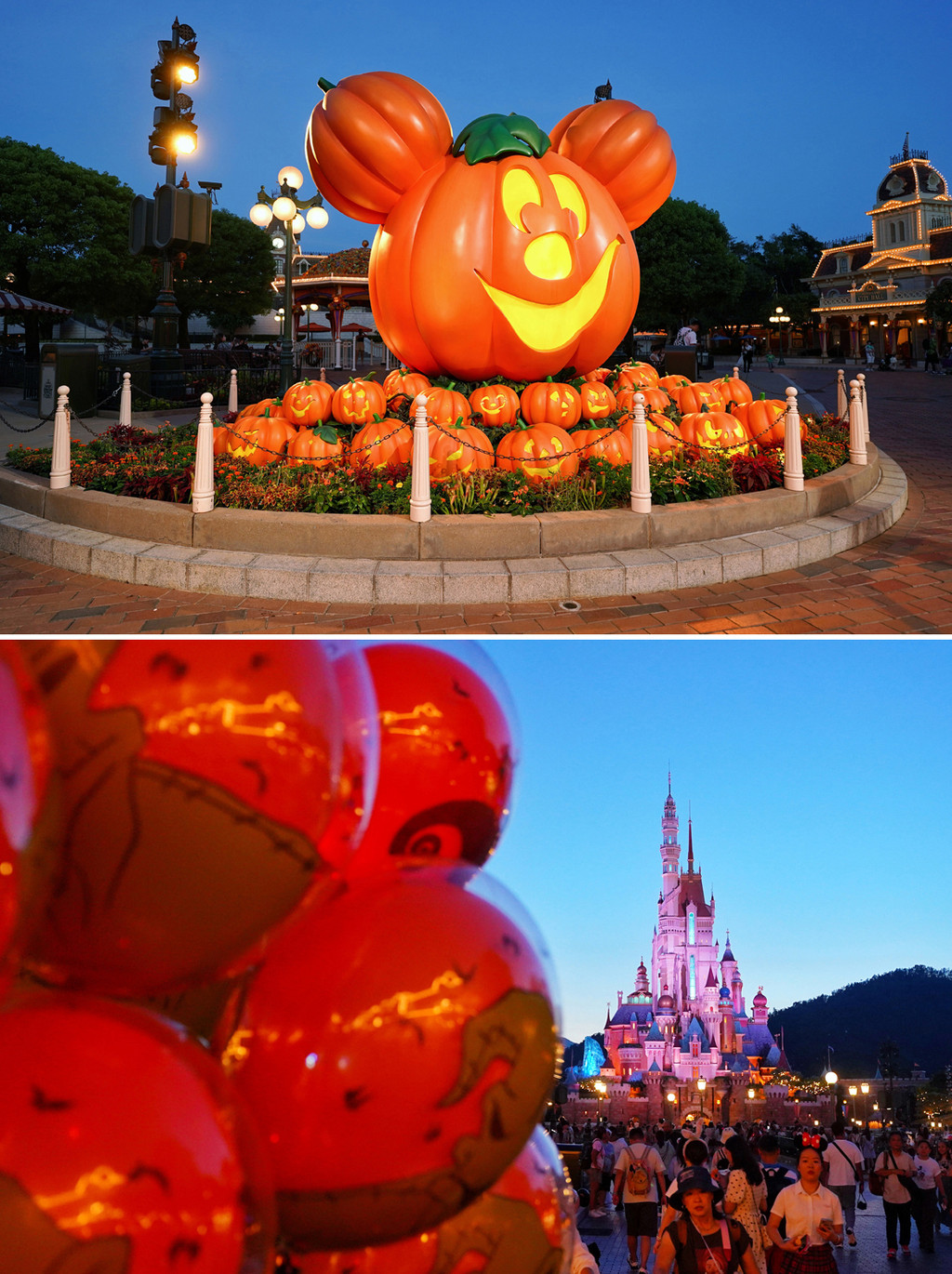 太阳渐渐落下,天空泛起绯红的的光晕,迪士尼城堡的灯光点亮起来,南瓜米奇的路灯也亮了起来,很多游客从纪念品商店购买了各式各样万圣节的装扮,趁着这蓝光时刻美美的自拍起来,所有人慢慢向园区主街靠拢,因为大家都在期待这一天最高超部分的到来,那就是迪士尼城堡焰火秀。