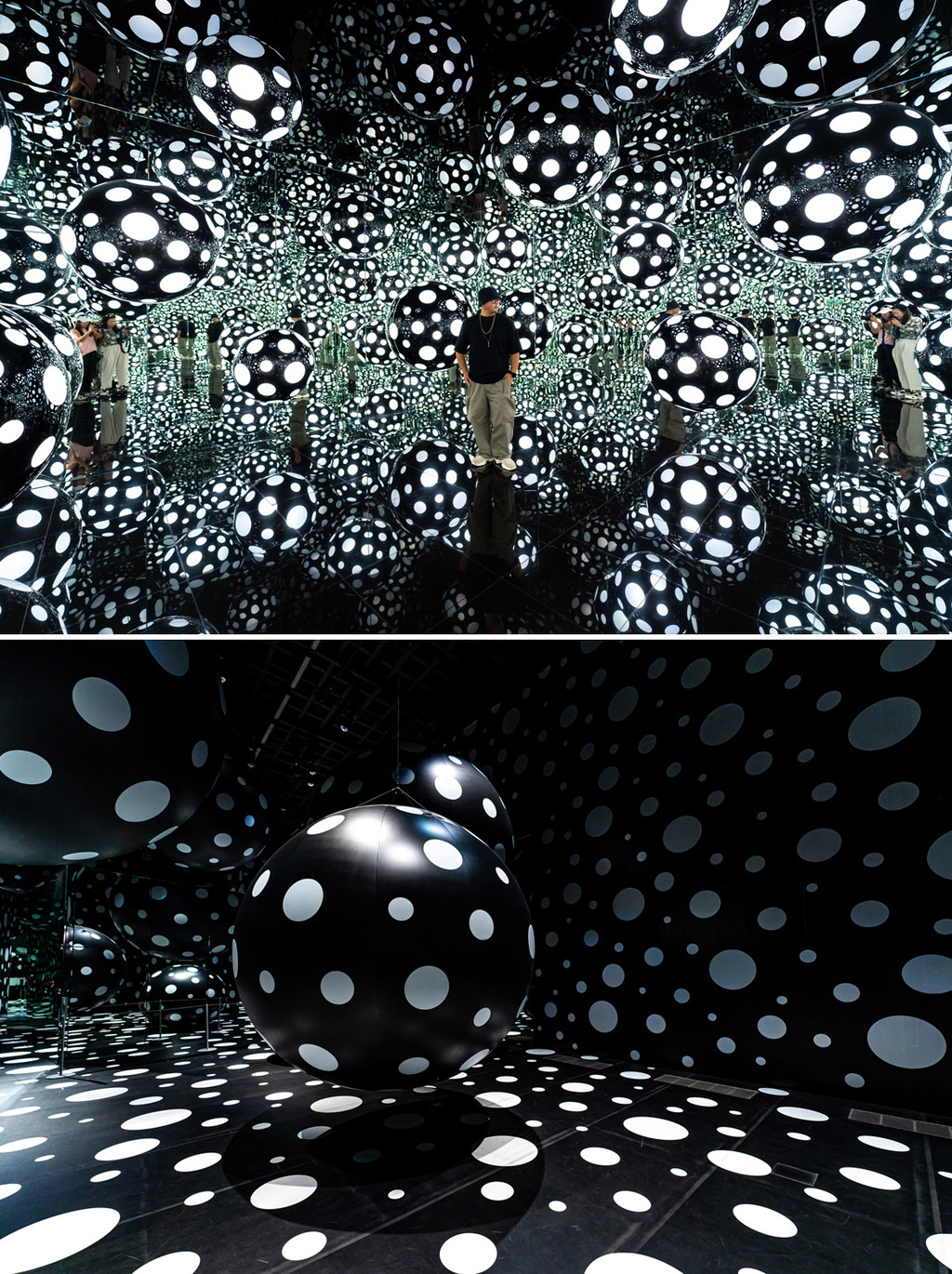 草间弥生的特展位于地下二层,偌大的空间展出了两个系列的展品,一处是室内纯黑环境里黑白波点球和玻璃镜面的空间装置,这也是我超爱的设计类型,太太太适合打卡拍照了。