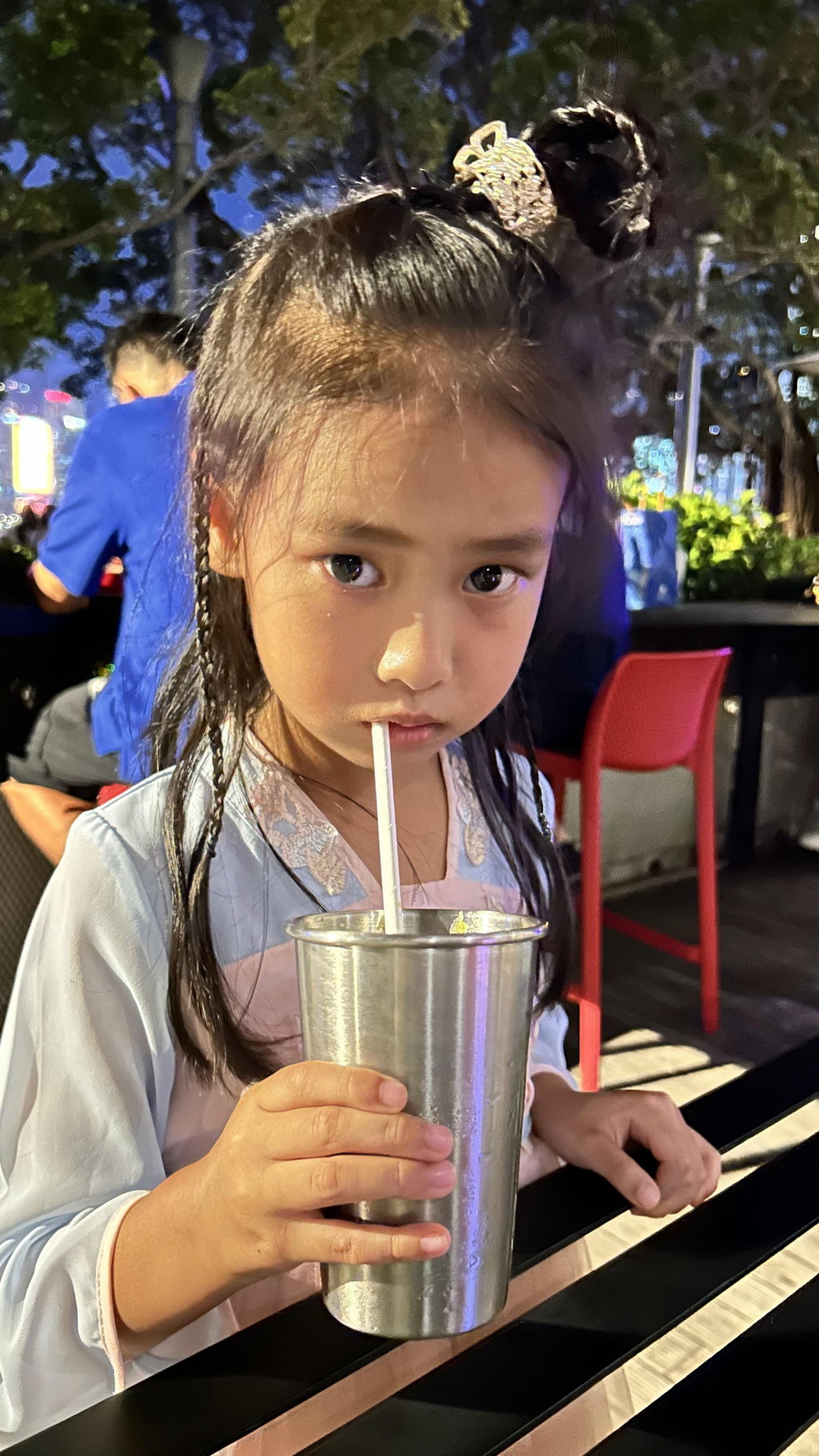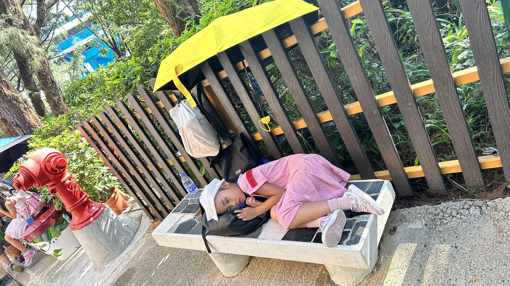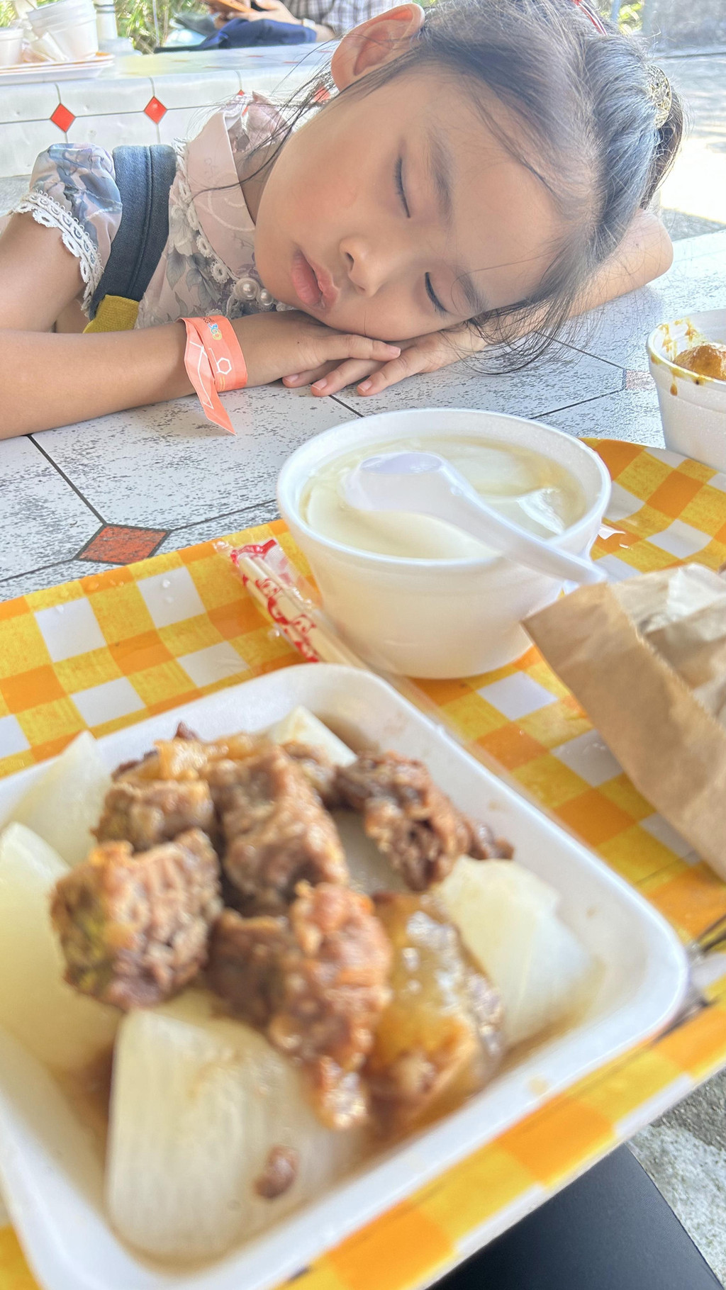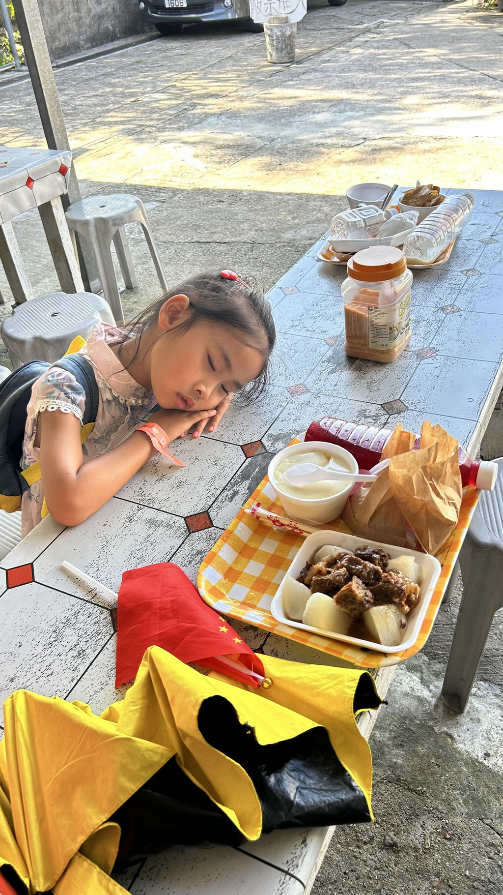 到了大屿山,下了缆车,我们都累的不行,又饿又困,来到一家卖山水豆腐花的餐厅,我去买饭的功夫,小公主就趴桌子上睡熟了。