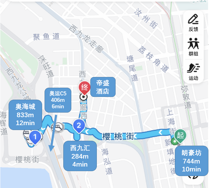 路线: 全程33分钟: 步行406米6分钟—东涌线 – 香港方向奥运C5入口– 乘坐2站4分钟到香港地铁站下车—步行1100米16分钟;
