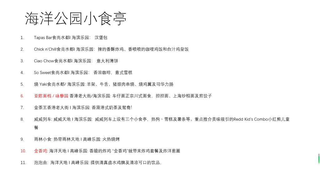 下图是所有餐厅的介绍,红色是我选择的餐厅。因为海洋公园的游乐项目对身高要求比较严格,很多都要达到1.2米以上,我们现在只有118cm. 所以今天的时间比较宽裕。