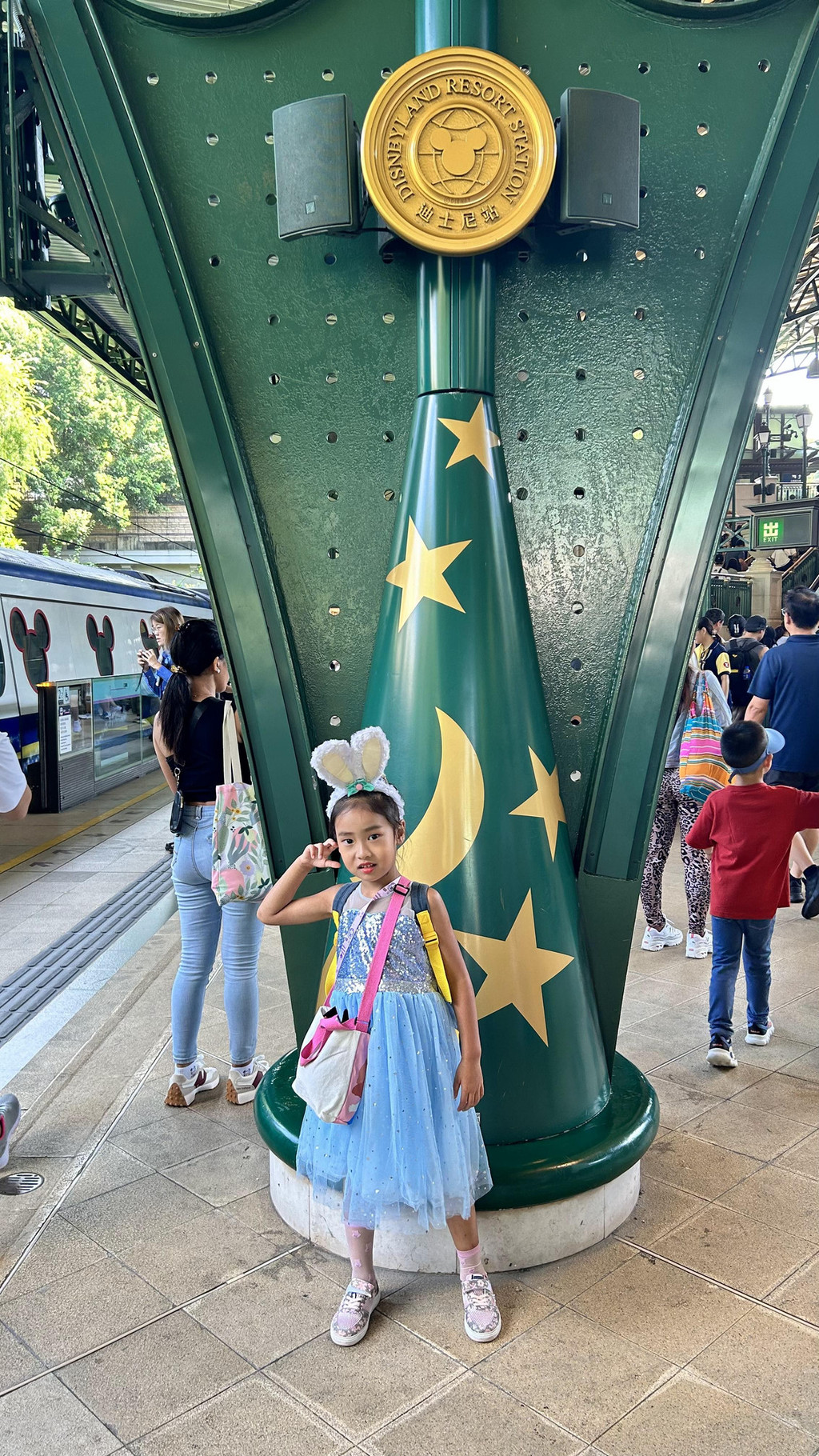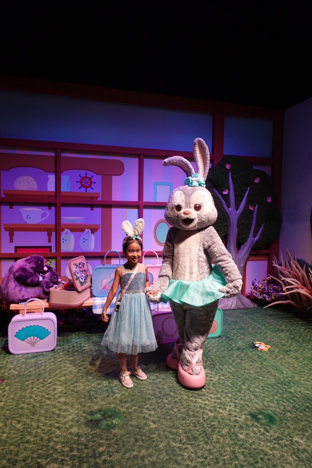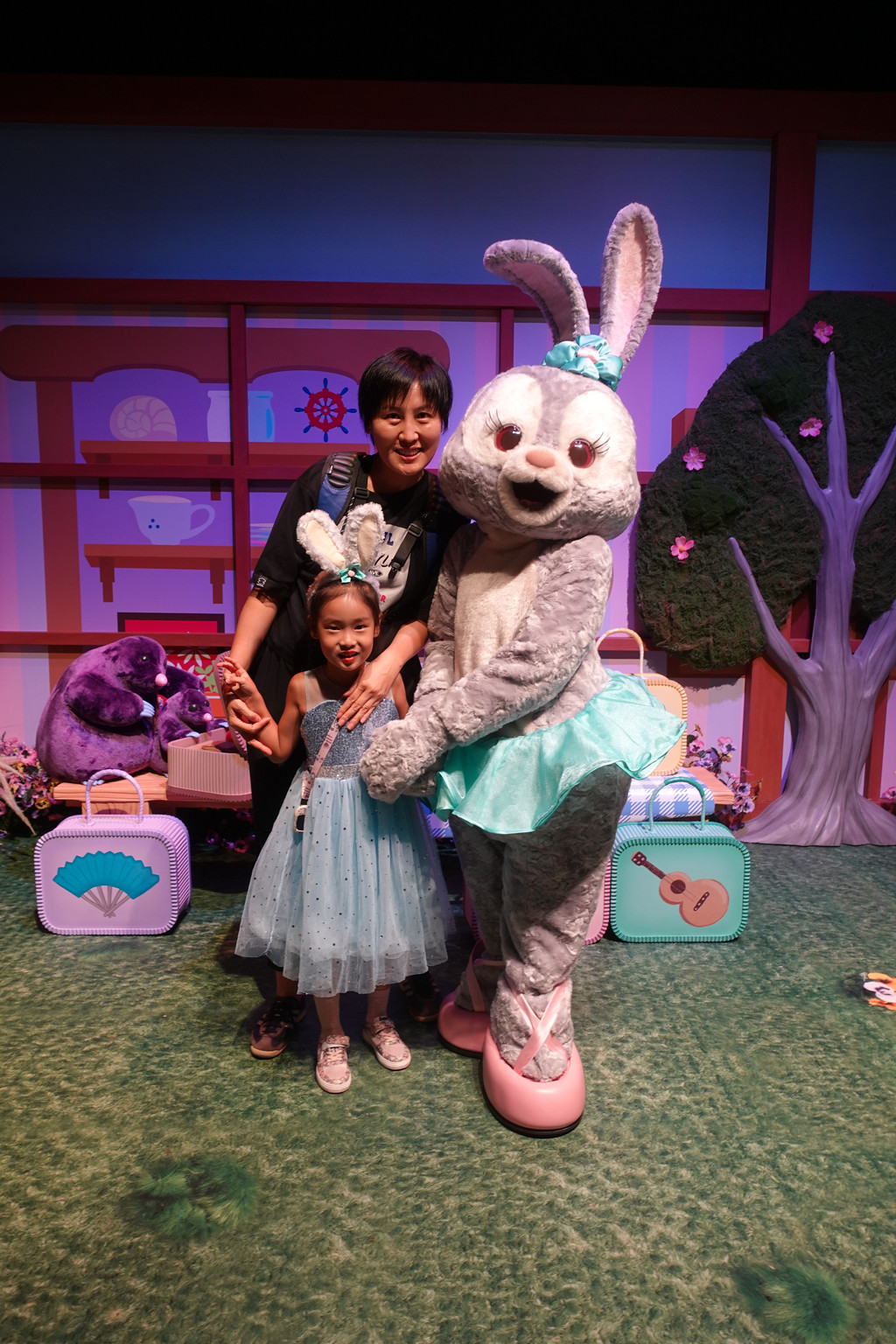 第一站,放弃在门口排队和米奇拍照,直奔达菲好友见面,离门口有一段距离,不是特别好找,最好问一下身边的工作人员。这次要见到Stellalou 星黛露。排了差不多15分钟就见到Stellalou,结束出来的时候,后面的队伍已经排的很长了。(每日见面都会有2个不同迪士尼好友的选择,今天自然是星黛露这边排队人数最多,另外一个好友是一个青蛙,恕我实在不知道这个青蛙在哪个动画片里出现过。)