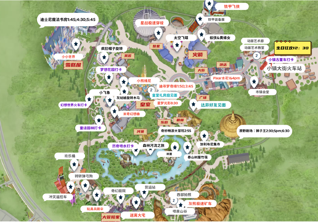 4. 熟悉地图: 其实我也是关注了一个月的迪士尼app地图和排队规律,才记清楚这些设施的位置,熟悉大致的位置和项目的热门程度,排队高峰时段分析,对于快速找到这些地方,减少路上浪费的时间起到很大的作用。