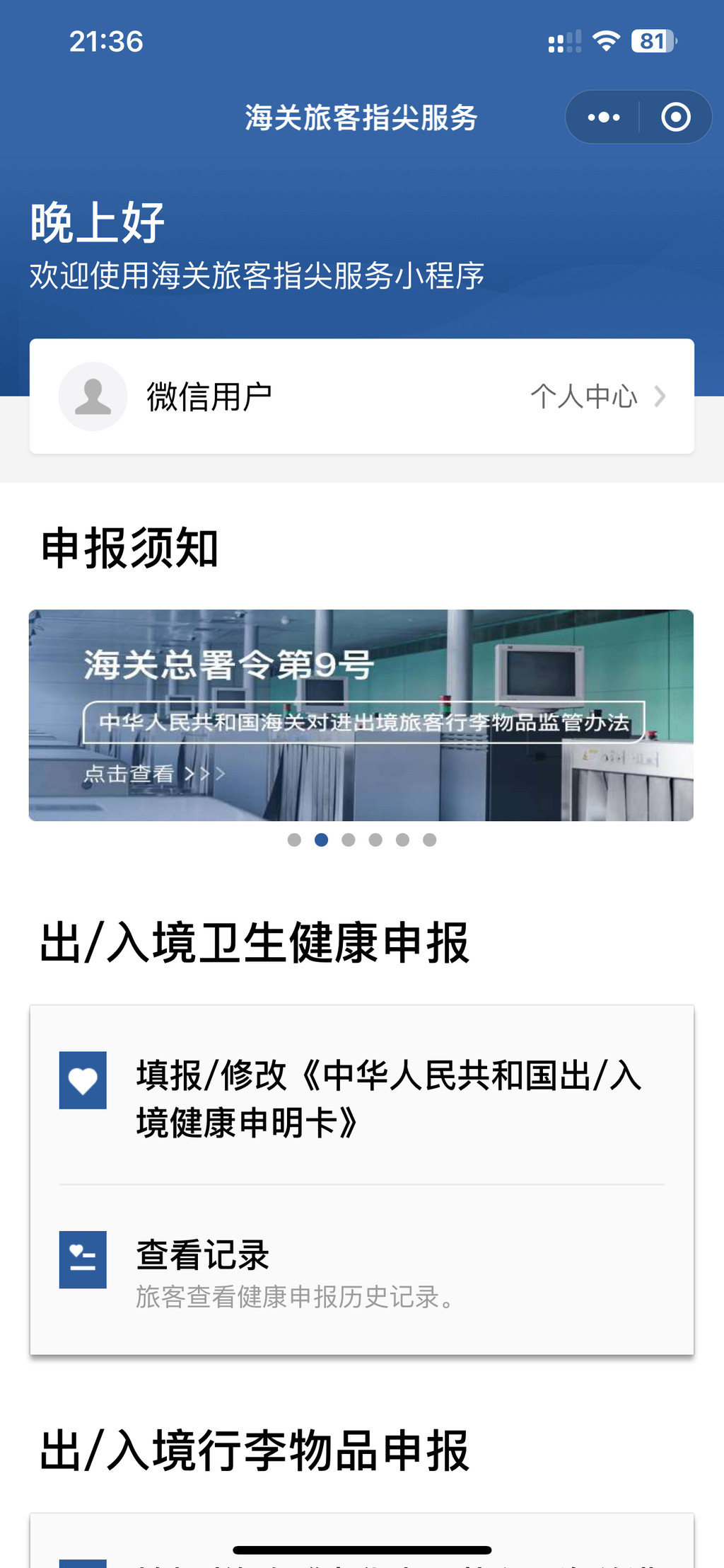 2,提前在手机微信小程序“海关旅客指尖服务”申报个人健康情况与随身携带的物品(可以查下海关相关要求),个人健康申报有效期为24小时,博主最近赴港未被要求出示黑码
