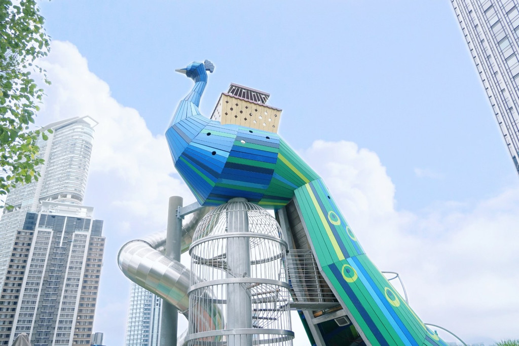 而七楼的孔雀滑滑梯也是小朋友们的最爱,我们去的时候正在维修,但在露台逛逛,也十分惬意。