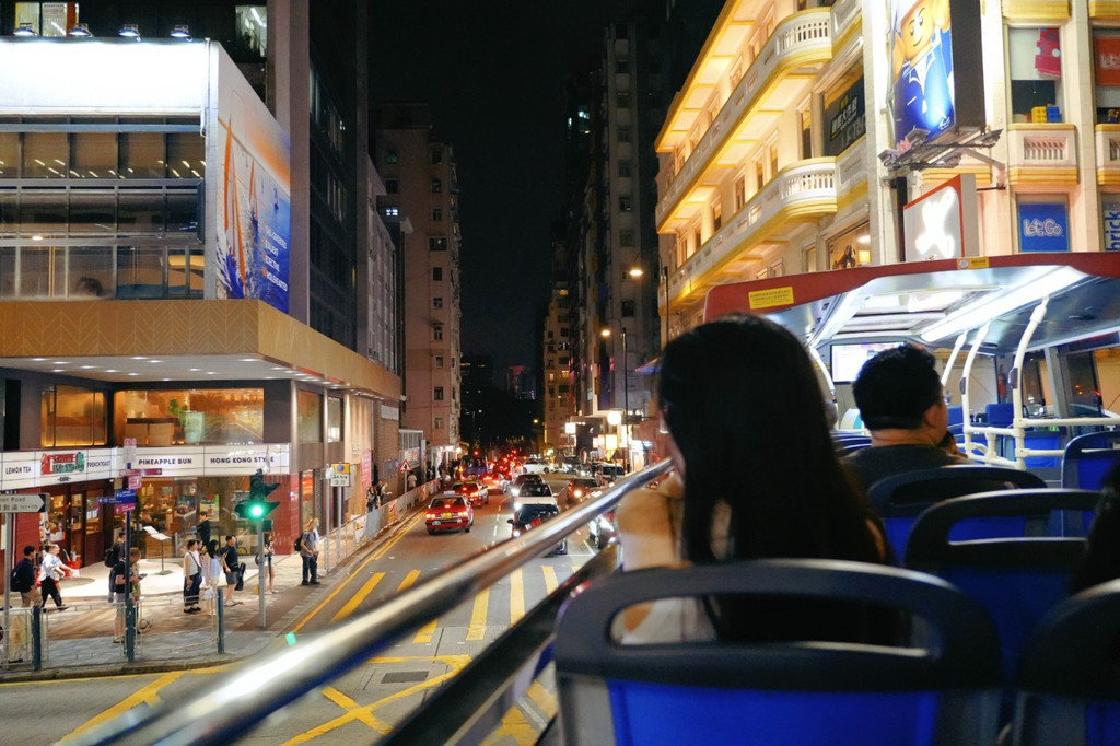 因为住在铜锣湾,所以我们选择了离我们更近的中环码头,搭乘参照传统人力车设计的敞篷双层巴士,夜游 香港 。