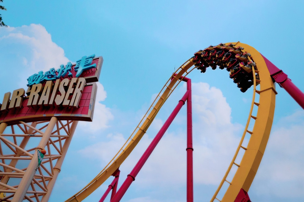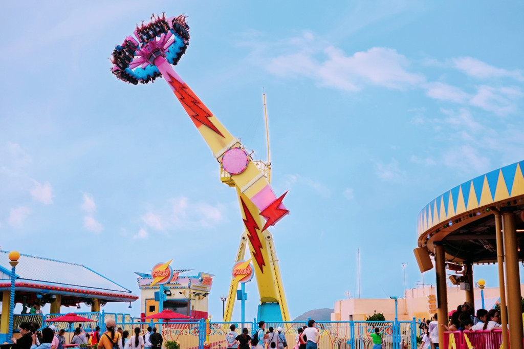 因为刚开园人少,所以山顶上各种游乐设施,几乎都不要排队。直冲动感天地,翻天覆地的360度大摆锤,超速旋风、动感快车等等,即使自己不玩,看着也能心跳加速,感受那份刺激感。