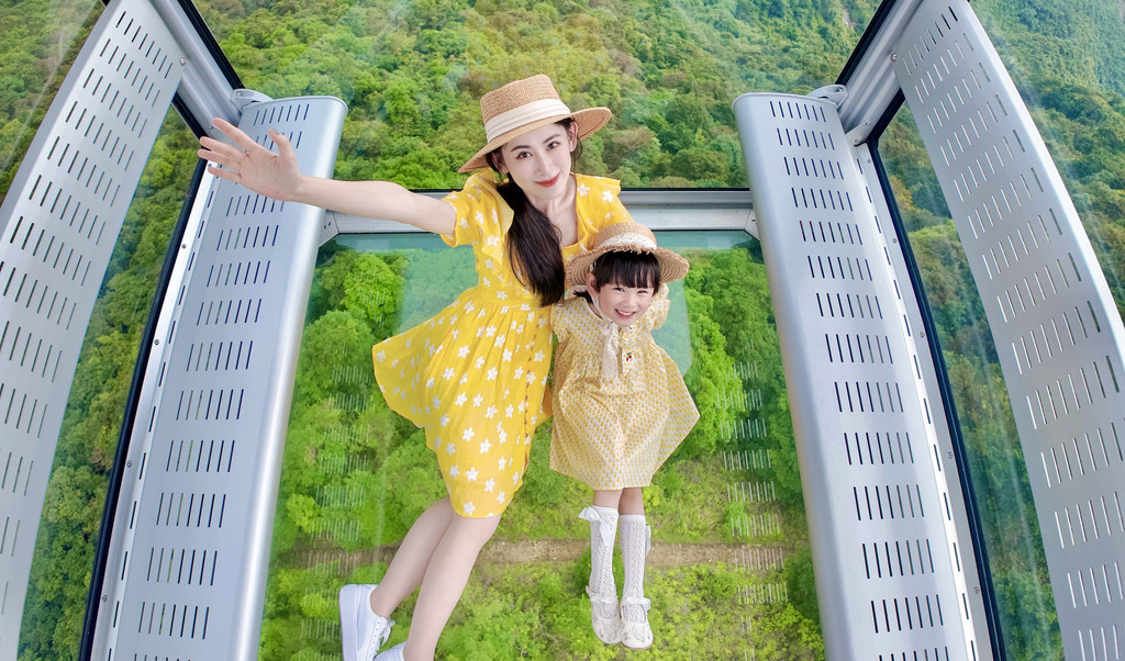 随着缆车越升越高,脚下的风景逐渐变得壮丽起来,群山叠翠,云雾缭绕,仿佛置身于一幅美丽的画卷之中。云宝兴奋地指着远处的风景,与我们分享着他的发现和想象。