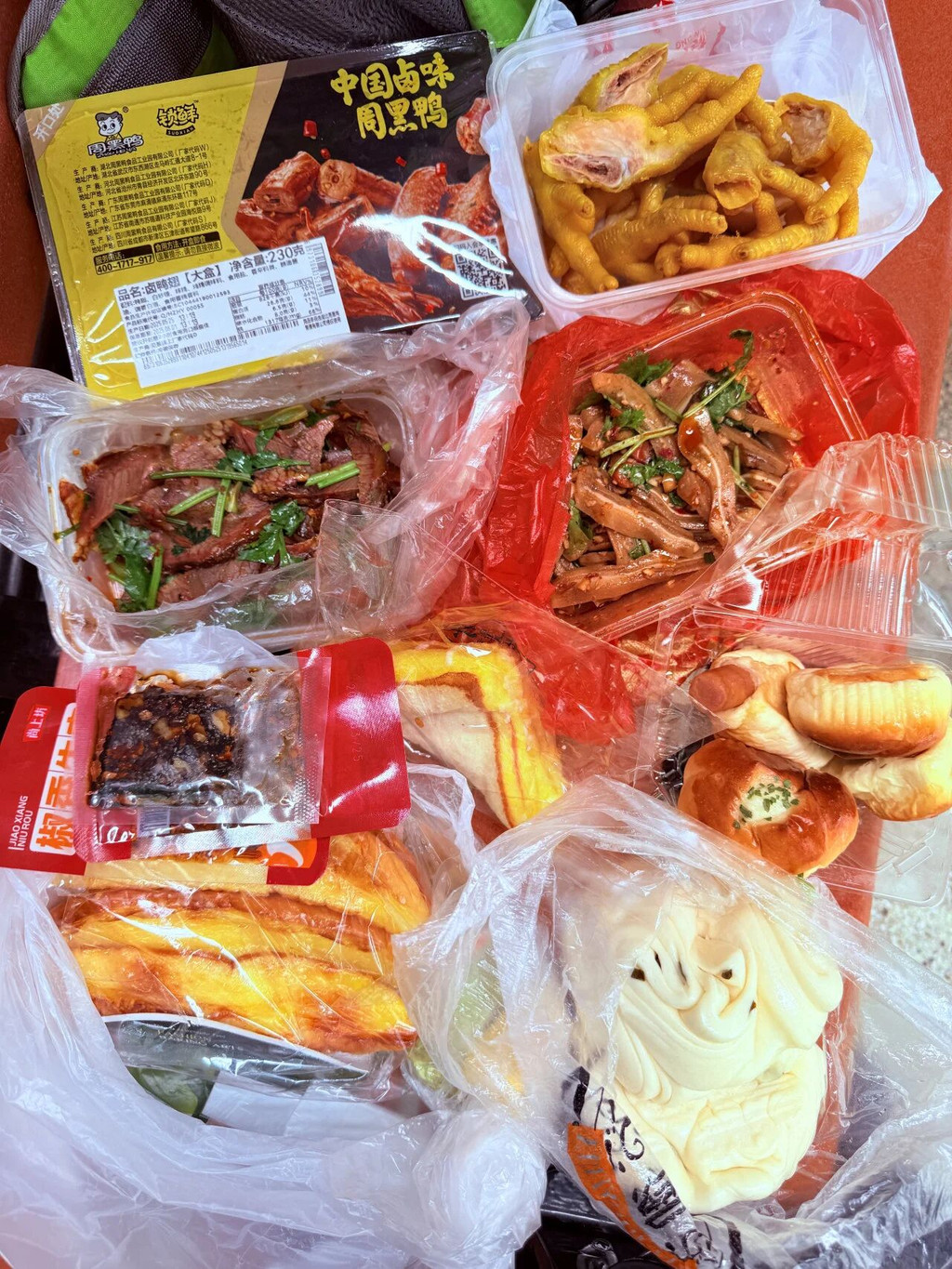 分享下这次爬山准备的硬核食物:潮汕卤牛肉、 四川猪耳尖、梅州盐焗鸡爪、麻辣鸭脖、面包、花卷...