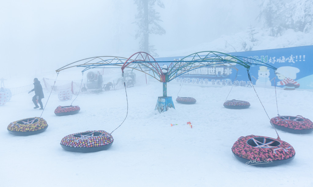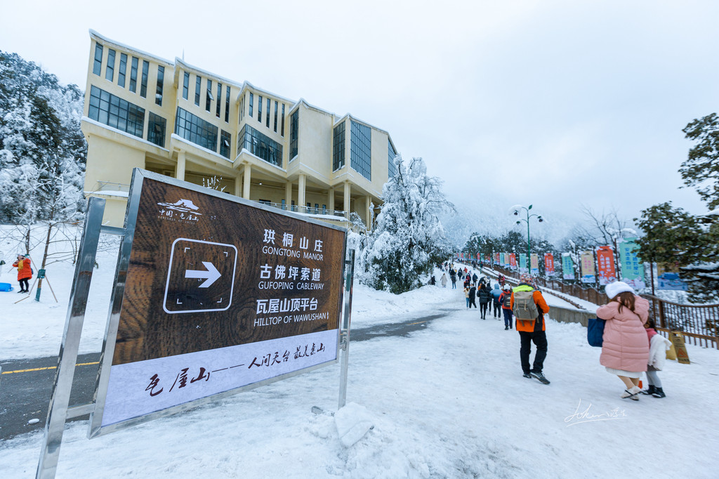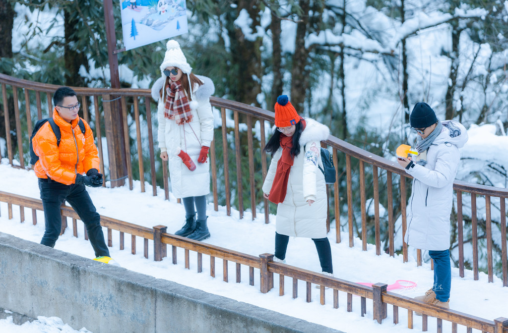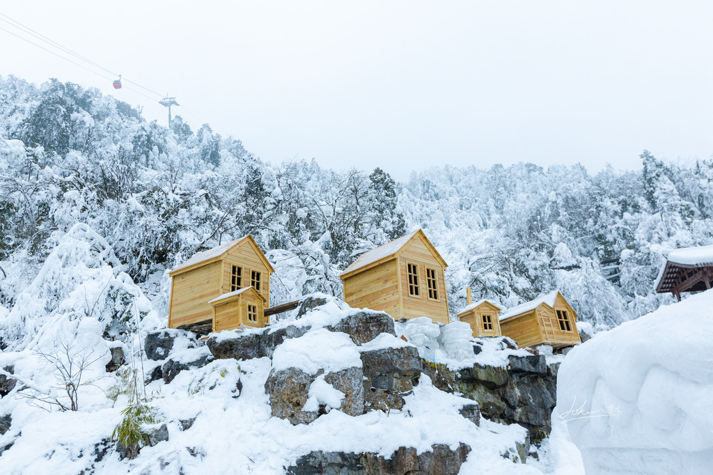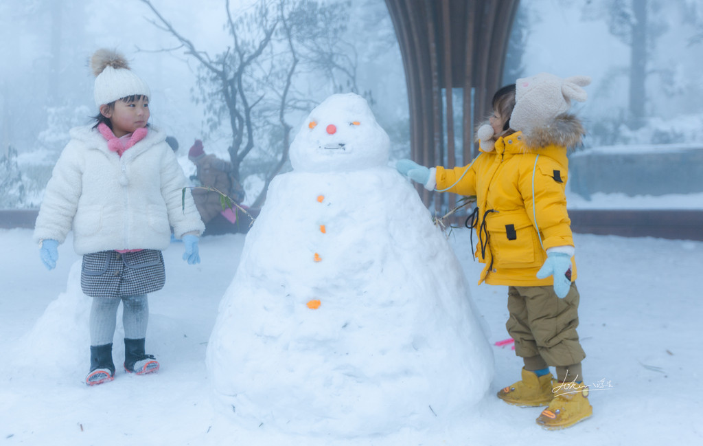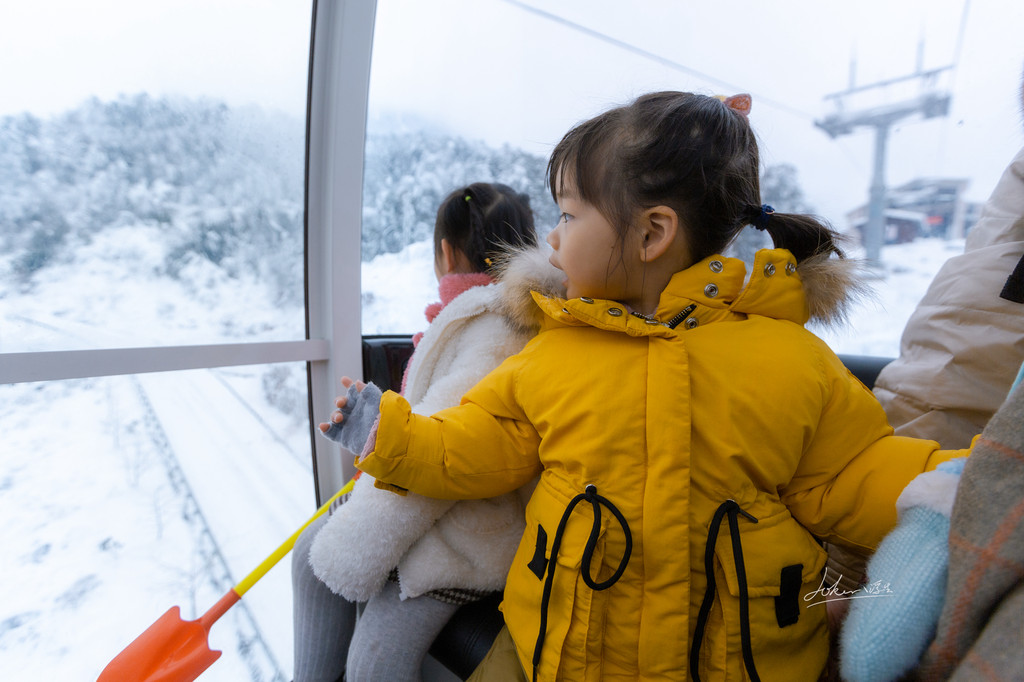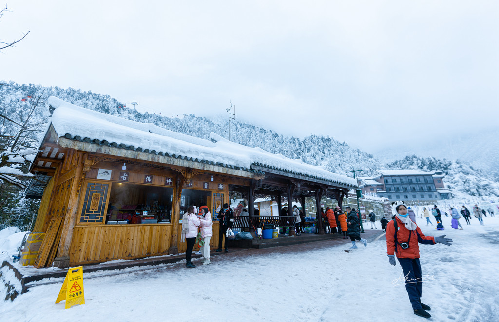4.尽早(建议景区开园时间就到达景区大门开始入园)进入景区乘坐索道上山,乘坐完第一道索道后,继续乘坐第二道索道直达山顶,先无需过多停留,因为整个山顶的观景栈道都有雪,边走边玩越往深处走,游客密度会逐渐降低,游览杜鹃园观景平台,到达 象尔山庄 ,有专门规划出来滑雪耍雪的区域,如果天气给力还可能在此处的观景平台看到云海,到达象尔山庄的时间在12点左右是最合适的,在这里吃午餐或者耍雪都可以,游玩到1点30左右,个人建议带娃出行或是体力一般的朋友根据个人情况适量徒步,尽早往正角寺乘坐索道返程,体力好并且还没玩够的朋友可以继续考虑走完接近6公里路程(沿途的雪景同前半段基本差不多的)。来到索道上站(正觉寺)乘坐索道下行至索道下站(古佛坪),在这里可以继续看看冰雕雪雕,以及在广场较空旷处再玩玩雪。在3点30前乘坐金花桥索道返回至景区门口,这样就能完美的避开清晨和下午的客流高峰,不用过多担心将时间耽误在排队等候上。