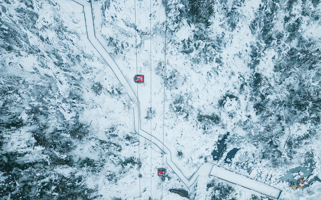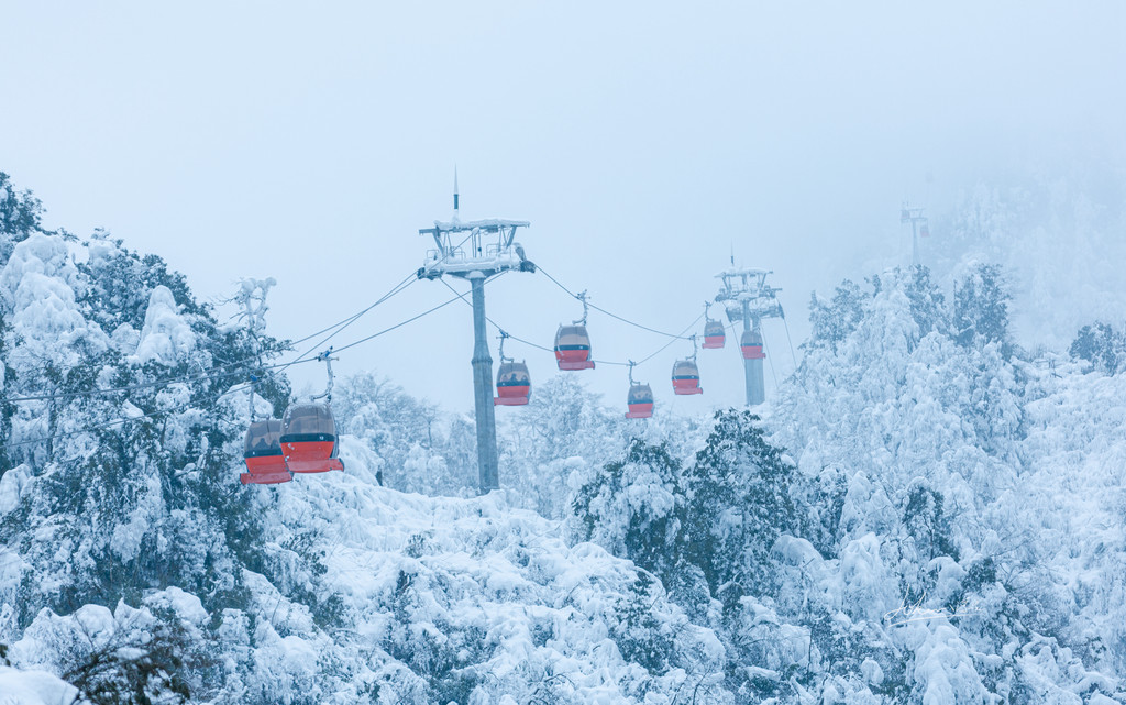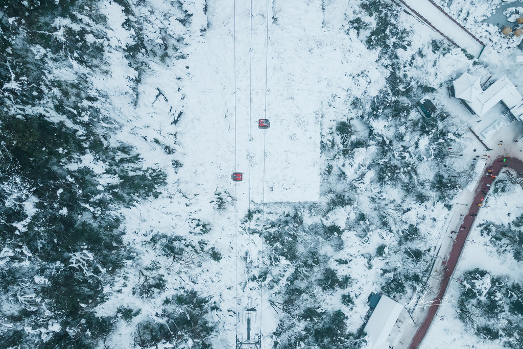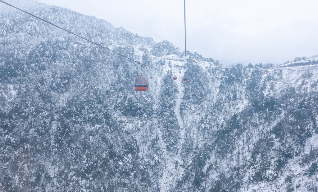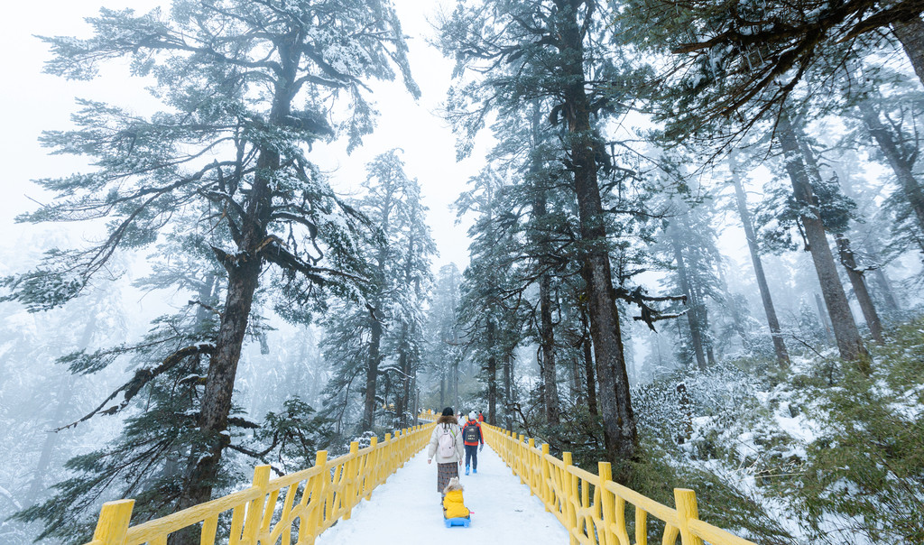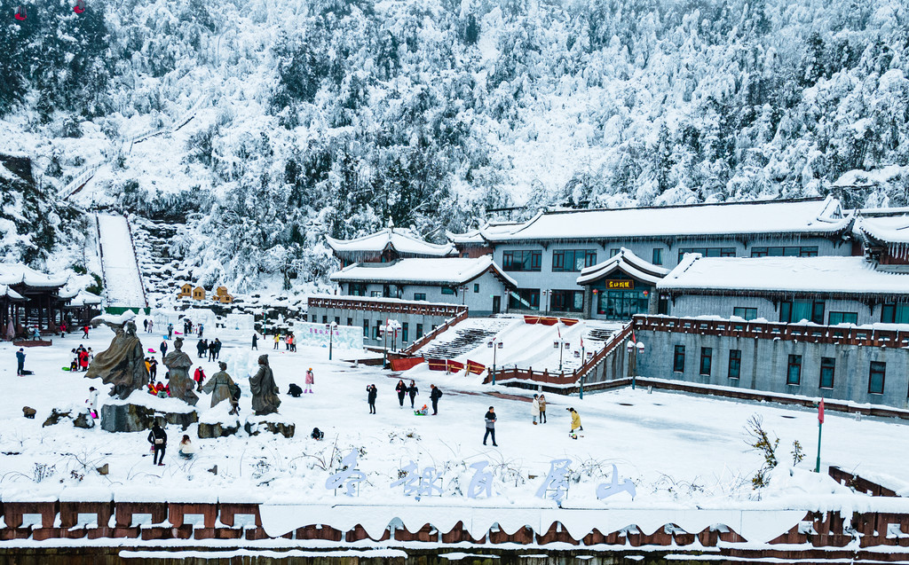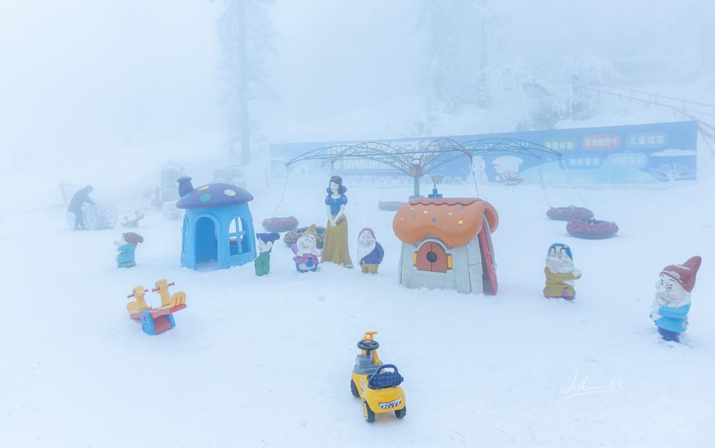 4.尽早(建议景区开园时间就到达景区大门开始入园)进入景区乘坐索道上山,乘坐完第一道索道后,继续乘坐第二道索道直达山顶,先无需过多停留,因为整个山顶的观景栈道都有雪,边走边玩越往深处走,游客密度会逐渐降低,游览杜鹃园观景平台,到达 象尔山庄 ,有专门规划出来滑雪耍雪的区域,如果天气给力还可能在此处的观景平台看到云海,到达象尔山庄的时间在12点左右是最合适的,在这里吃午餐或者耍雪都可以,游玩到1点30左右,个人建议带娃出行或是体力一般的朋友根据个人情况适量徒步,尽早往正角寺乘坐索道返程,体力好并且还没玩够的朋友可以继续考虑走完接近6公里路程(沿途的雪景同前半段基本差不多的)。来到索道上站(正觉寺)乘坐索道下行至索道下站(古佛坪),在这里可以继续看看冰雕雪雕,以及在广场较空旷处再玩玩雪。在3点30前乘坐金花桥索道返回至景区门口,这样就能完美的避开清晨和下午的客流高峰,不用过多担心将时间耽误在排队等候上。