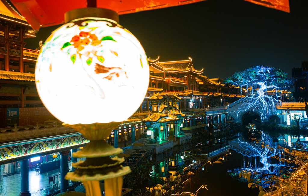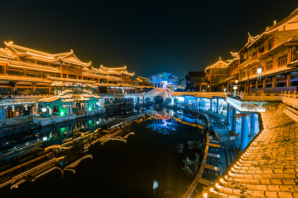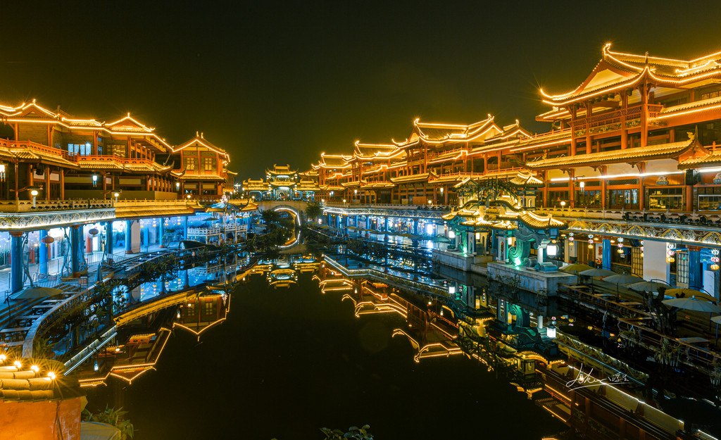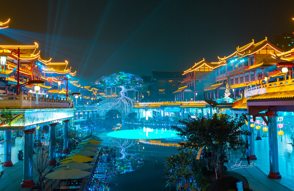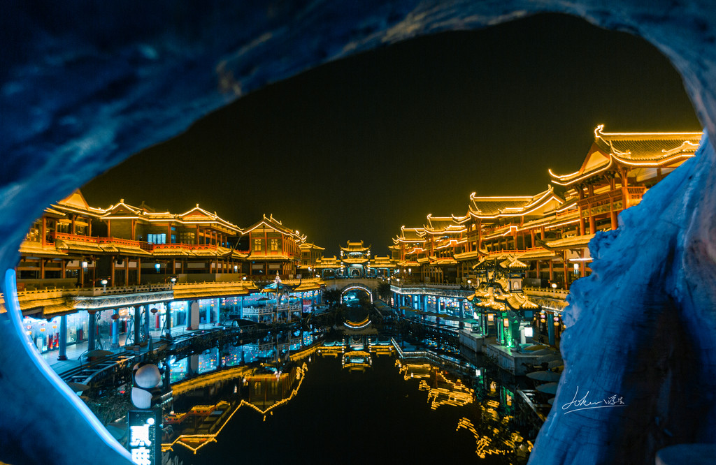 古风建筑群鳞次栉比,气势恢宏,临水而立,白天车水马龙、金碧辉煌,夜晚流光溢彩、疏影横斜。特别是到了晚上,变换的灯光秀,仿佛隔着千年一窥大宋盛世光景。