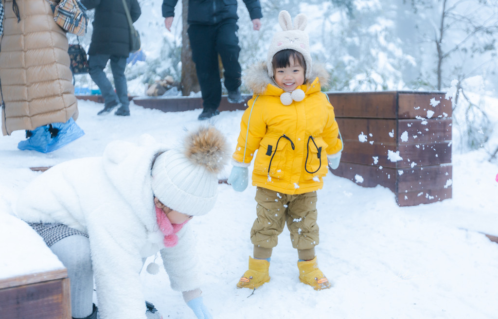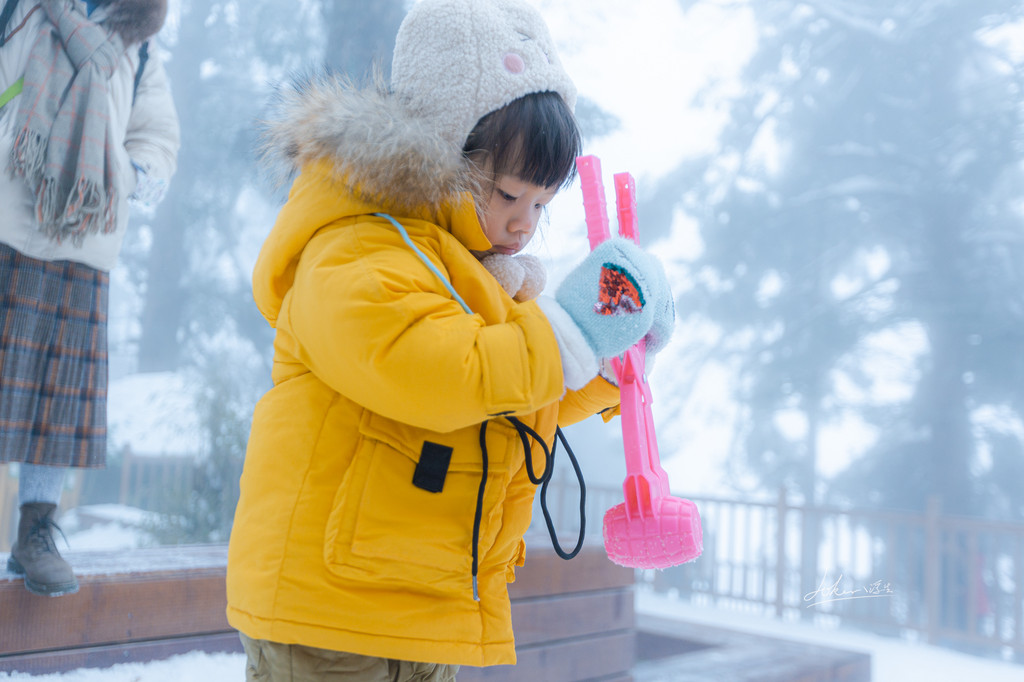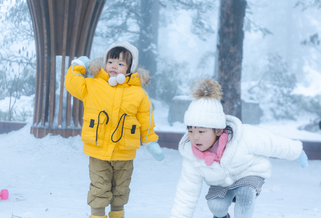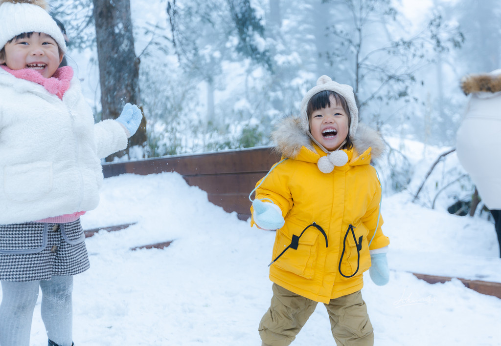 在杜鹃园观景平台这里,虽然周身都是漫天大雾,但依然无法妨碍小朋友们对雪的亲切感,也许这就是两小无猜吧。多去感知周遭的一切,比起放在温室里成长更能让天性得到释放,走进大自然中更快乐的成长。