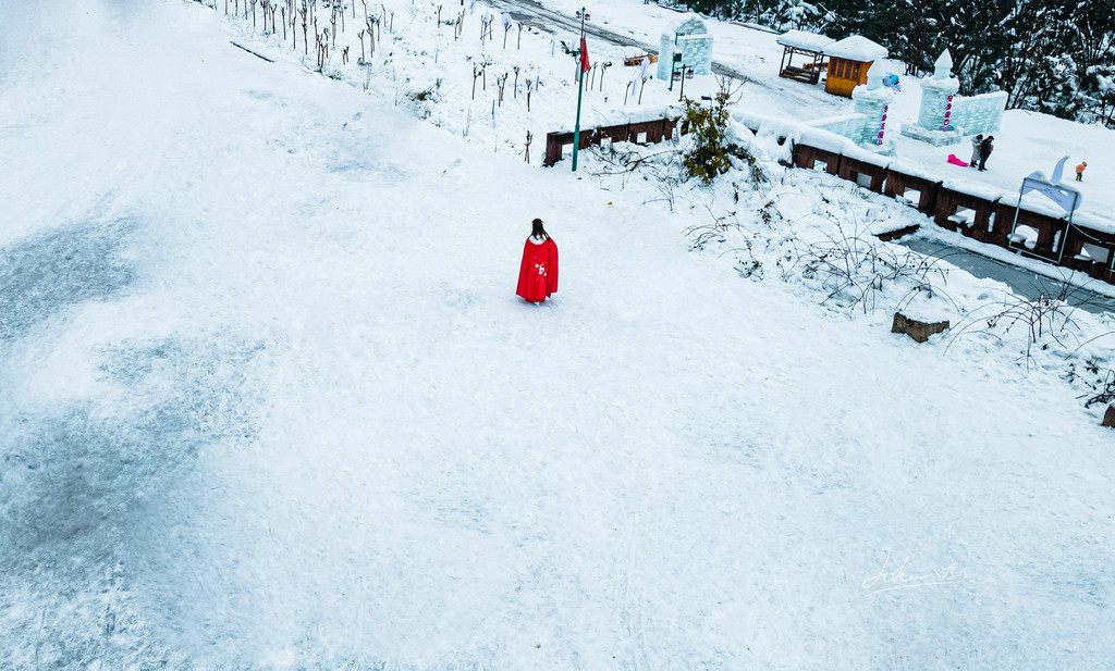 小姐姐身着汉服,走在雪地中也是仙气飘飘,无人机飞到空中恰好捕捉到这幅画面。