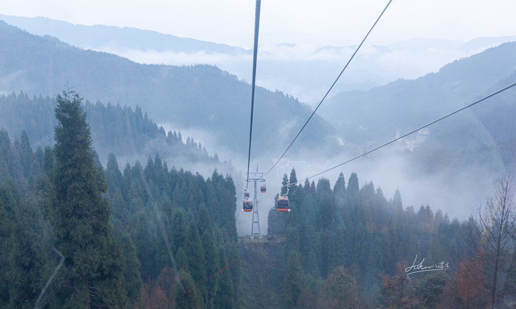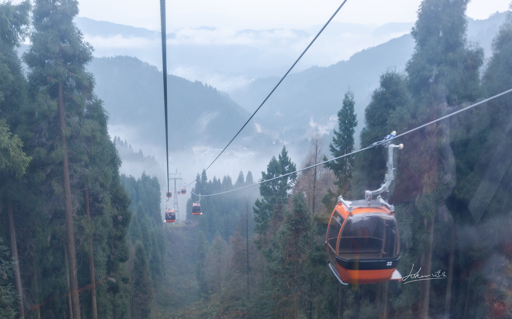 乘坐缆车逐渐向上攀升,山间的云雾缭绕,从高处俯瞰感觉置身于仙境之中。
