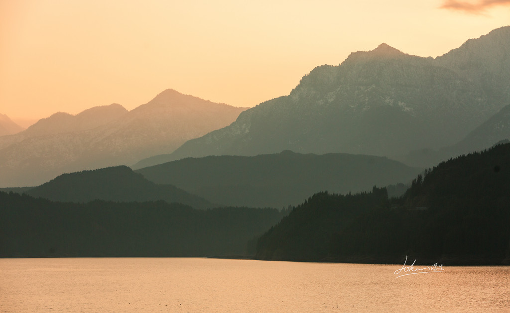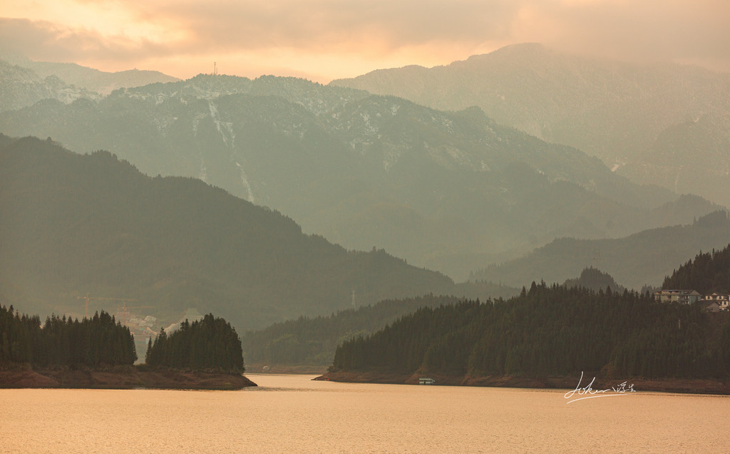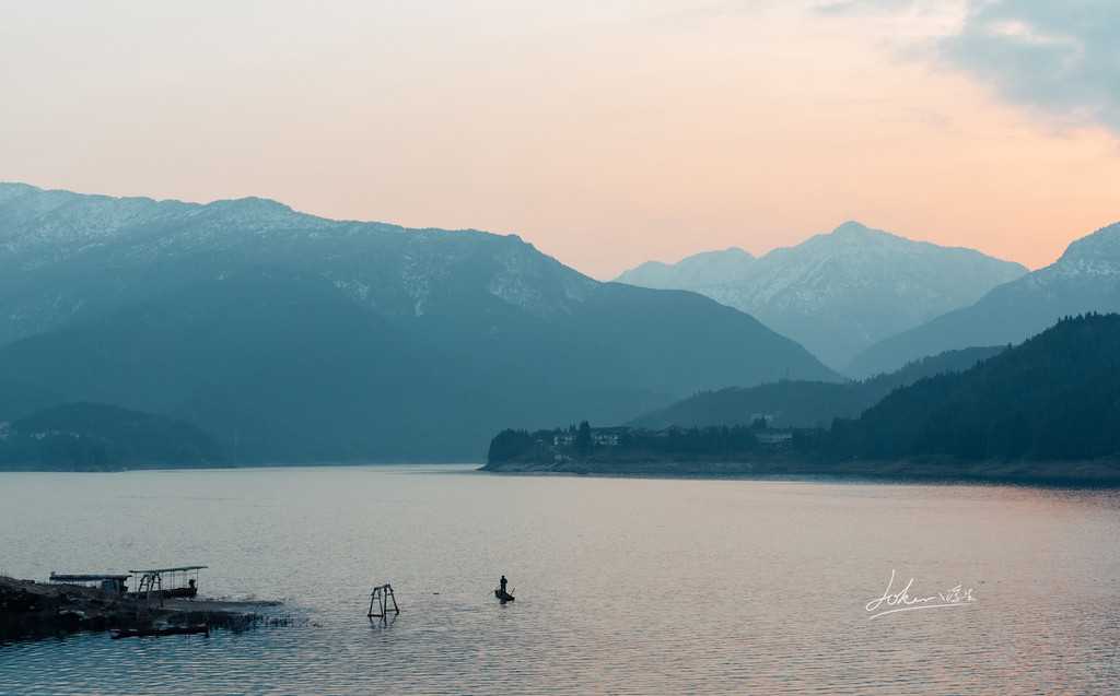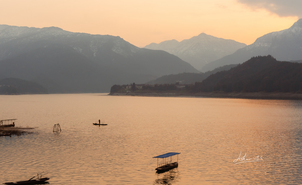 夕阳西下的雅女湖,湖上的打鱼人还在湖中荡漾,这样的感觉颇有渔舟唱晚的意境。远处的瓦屋山上也能隐隐绰绰的看到有雪的覆盖,感慨大自然的奇妙,同时也更加期待瓦屋山的旅程。