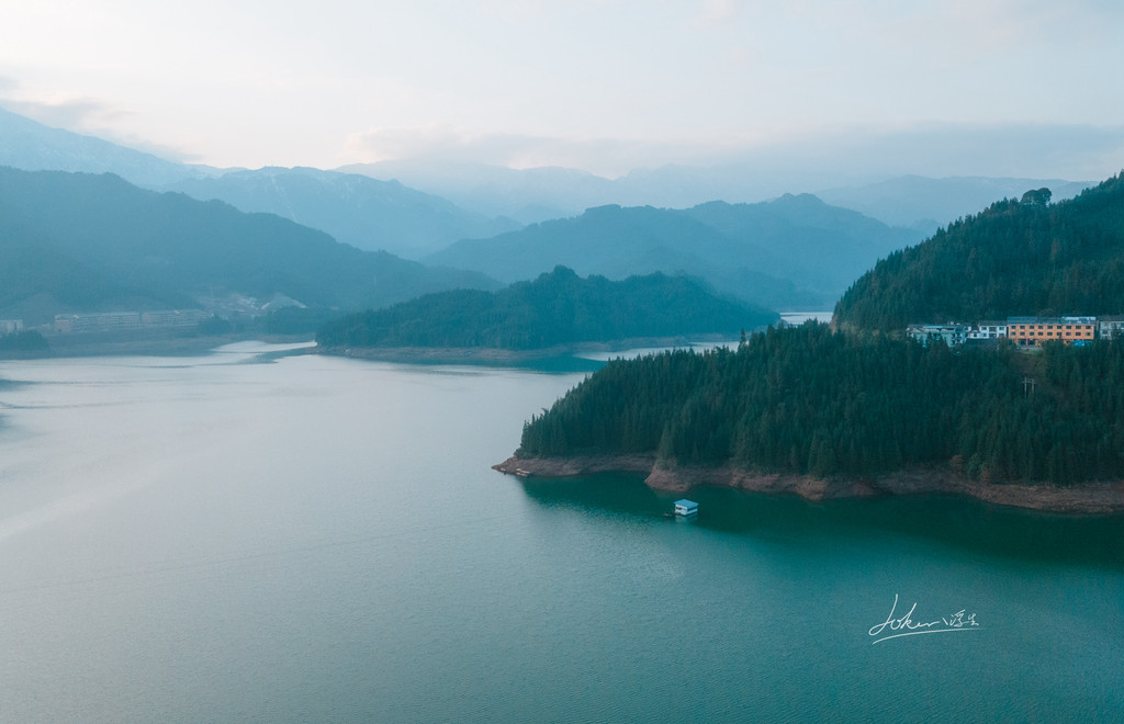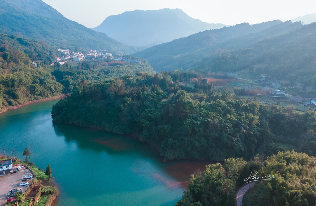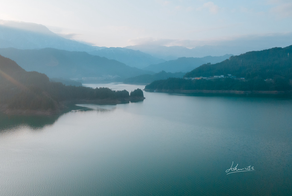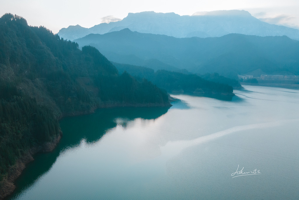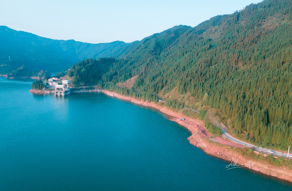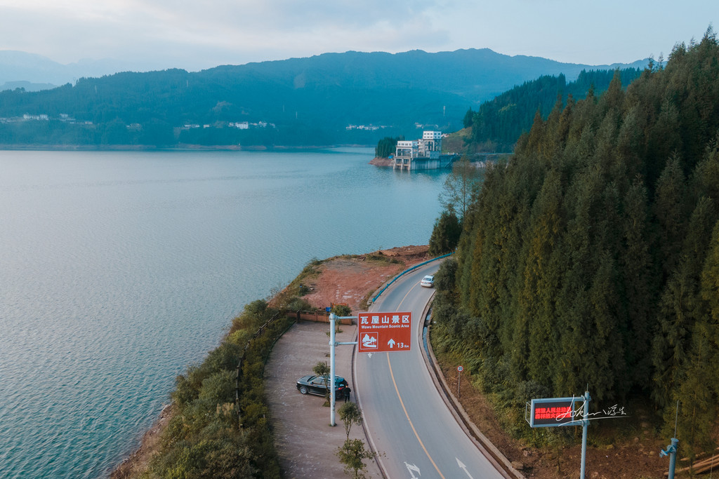 离开望鱼古镇,继续行驶,离瓦屋山越来近了,穿过最后一个隧道,雅女湖映入眼帘,傍晚的阳光依然柔和,洒在水面上,又照在远处的瓦屋山顶,将无人机起飞,在空中俯瞰雅女湖,眺望瓦屋山。