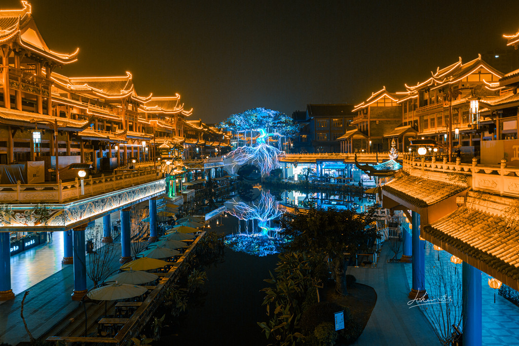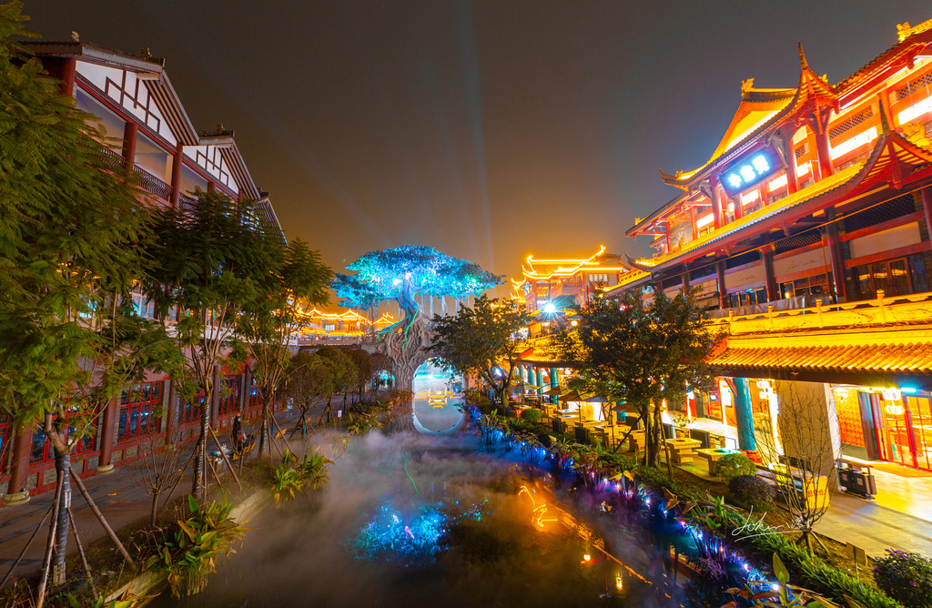 灯光秀一直会持续到11点,所以想要看夜景的朋友完全不用过于担心,这次为了避免遭遇“人从众”的景象,便决定舍弃观看表演的时间,9点左右到达水街中心时网上那种人山人海的情景完全没有遇到,基本没有什么游客了,就这样沿着河道,围着灯光巨树,从一楼转到二楼,又从二楼拍到一楼,不同的角度去感受这里的奇幻夜景。