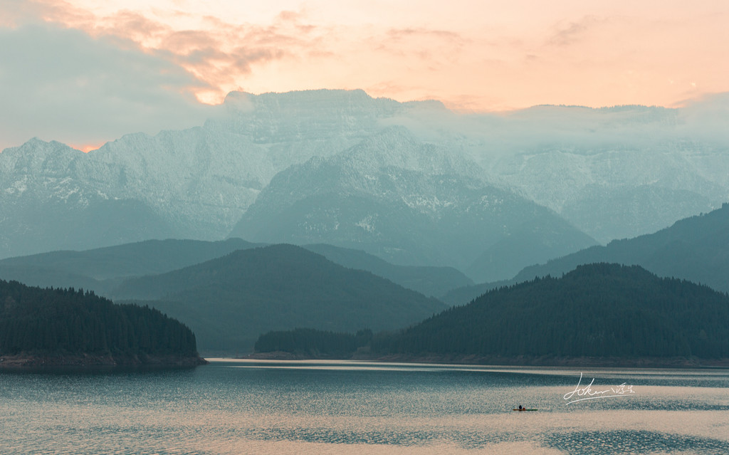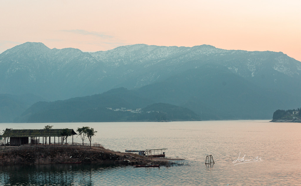 小小的渔船在瓦屋山前游荡,一抹腰带云缠绕在瓦屋山周围。这样的景象宛如水墨画一般,陪着一姐在这里驻足了很久,她也很有耐性的眺望着周遭的一切,偶尔转过头来问:爸爸,我们什么时候去玩雪呀...这样的感觉真好。