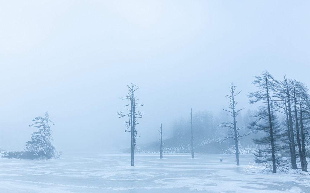 吃完午饭后,继续徒步前往到达鸳鸯池,感受鸳鸯池冰湖雪景,除了周遭的雾气比较大,却还是让人感觉沉浸在冰雪的童话世界里。雾中的鸳鸯池若隐若现又是另一番不同的感觉。