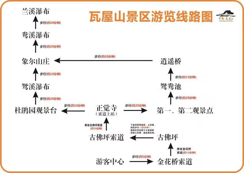 我们此行瓦屋山耍雪的路线是这样规划的:游客中心(起点)→金花桥索道→古佛坪→古佛坪索道→正觉寺→杜鹃园观景平台→象尔山庄→逍遥桥→鸳鸯池→正觉寺→古佛坪→游客中心。