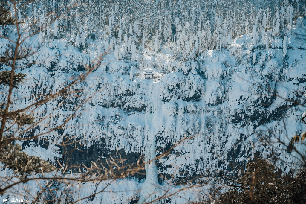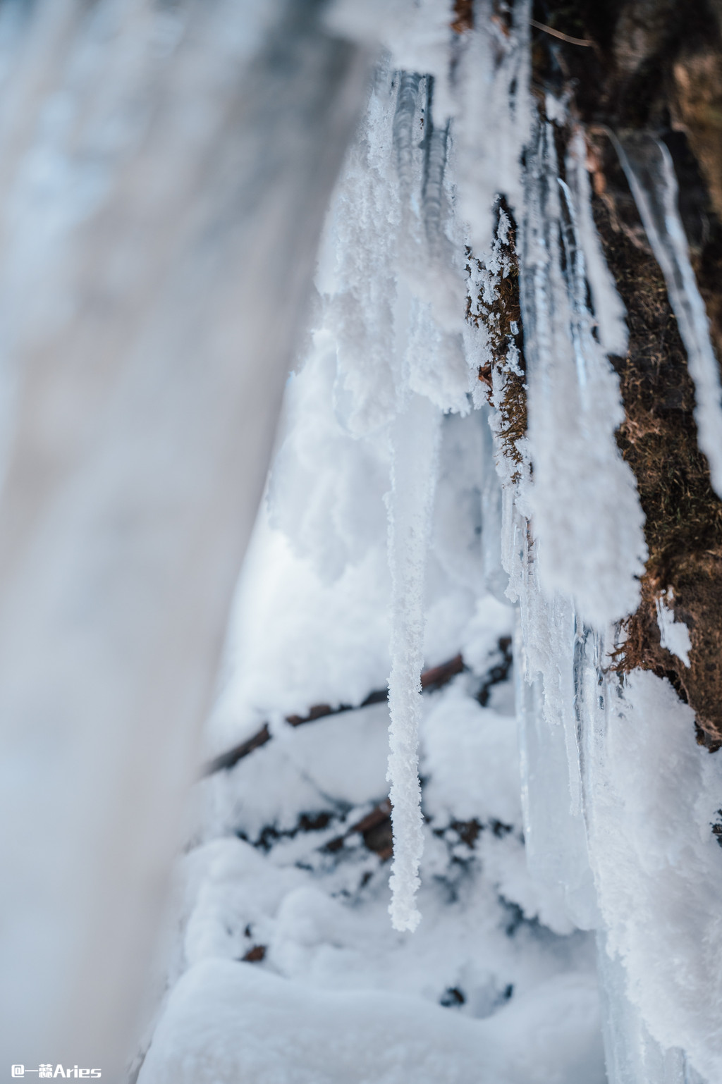 靠近它时就能和冰瀑来一场亲密的接触,从崖顶凝结的冰柱和冰挂,顺着山势落下,晶莹剔透。