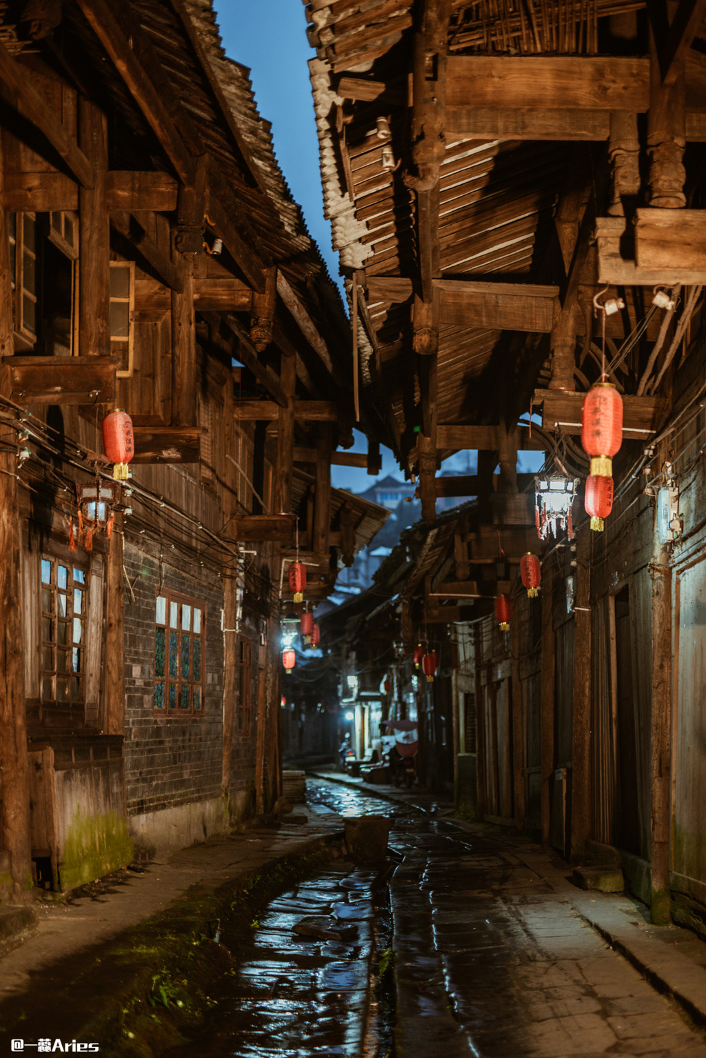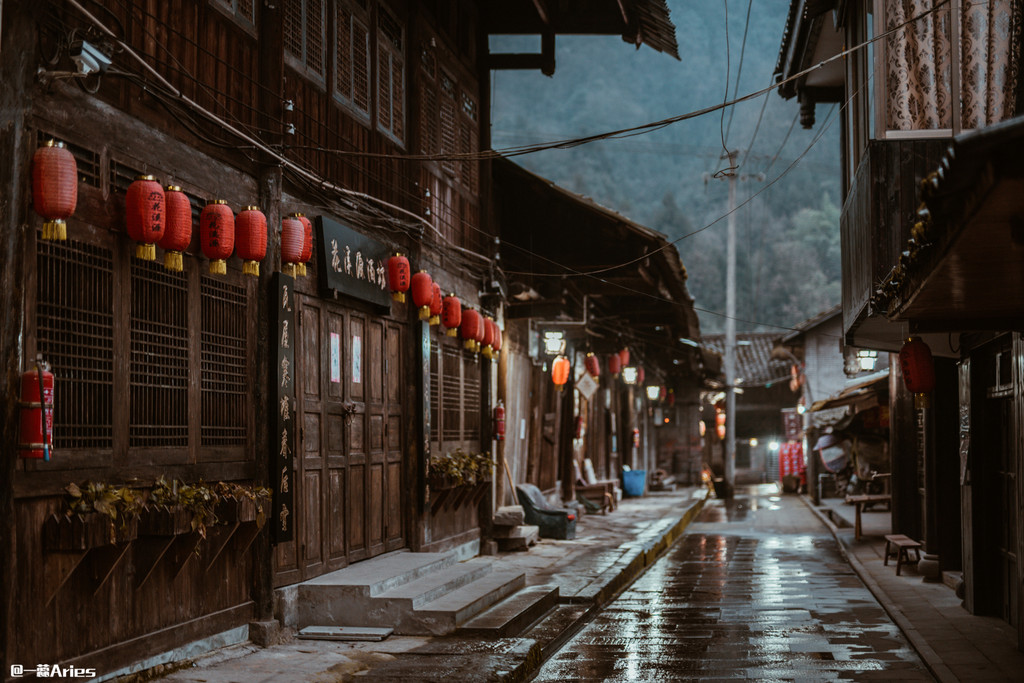 无人的街被暖暖的路灯照亮,屋檐上的降雪融化成水滴,将青石板晕染出厚重的光泽 ,不用钉子建造的干栏式木楼错落倾斜着,古色古香的窗格、匾额以及偶见的精美图案雕刻,幽长光滑的青石板路在瓦楞相接的老宅相拥下,透出一线幽蓝的天光。