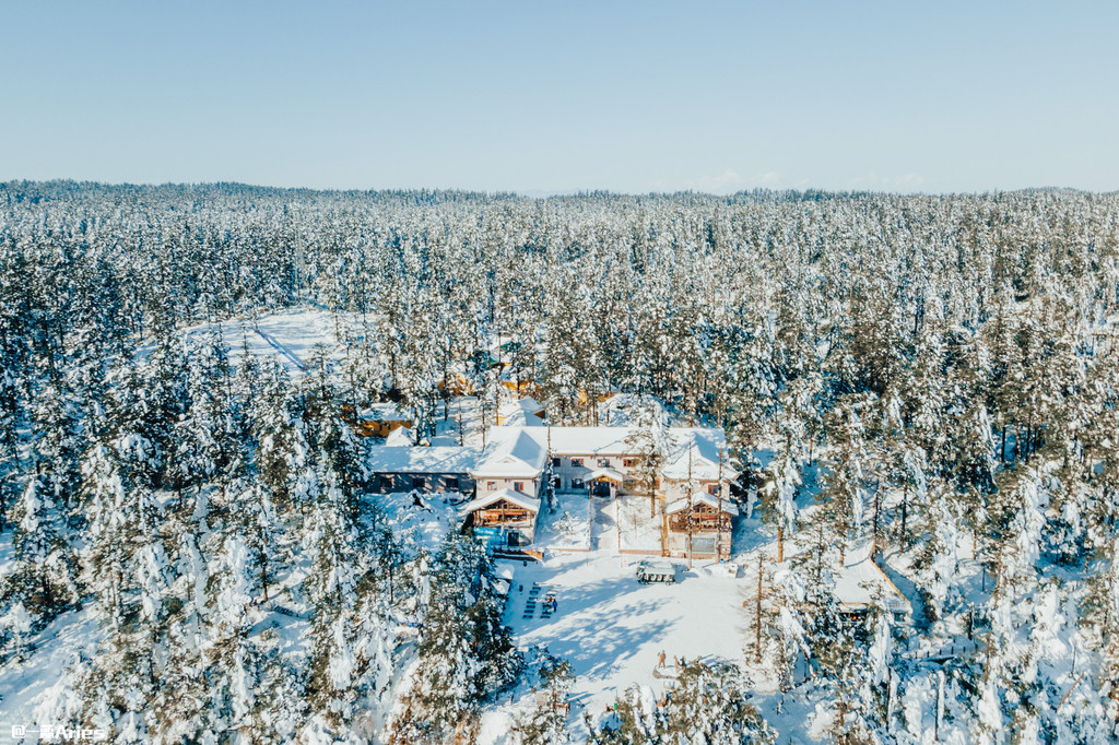 象尔山庄的黄色小房子从林间跳跃而出,房檐上不时挂着几根小冰柱;踩在厚厚的雪毯上,咯吱咯吱的声响,谱成一曲欢快的冬日歌谣。