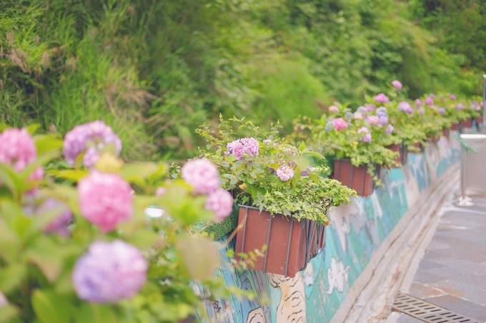 瓦屋山风景区从酒店出发,5分钟车程便到了景区门口,入口处的盆栽绣球花挂着晨露