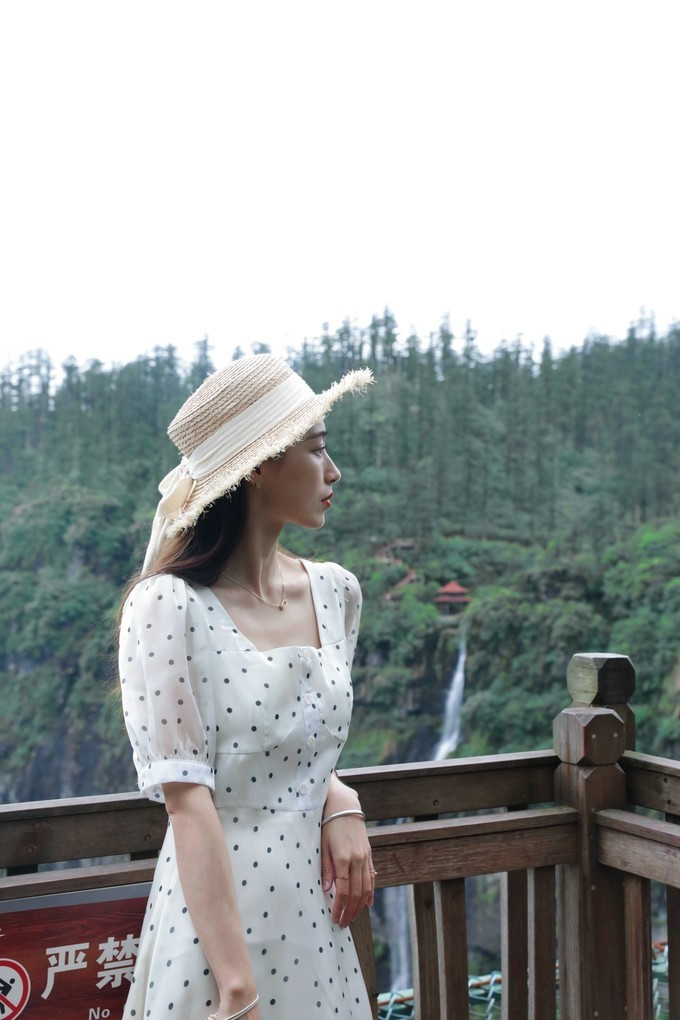 如丝带般镶嵌在山林中的白色瀑布,由平地向更低的沟里跌去
