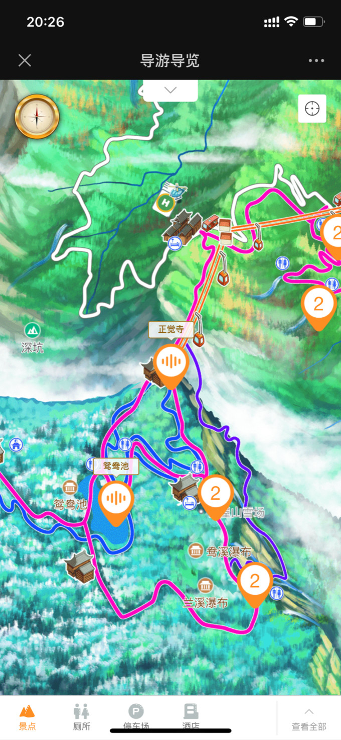 古 佛坪 索道上站(向左)--杜鹃园(步行400m约15分钟)-蘑菇小镇(步600m约20分钟)-象尔戏雪场(步1100m约60分钟)--逍遥桥(步行1300m约40分钟)---鸳鸯池(步行7500m约25分钟)-索道上站(步行2000m约70分钟)。
