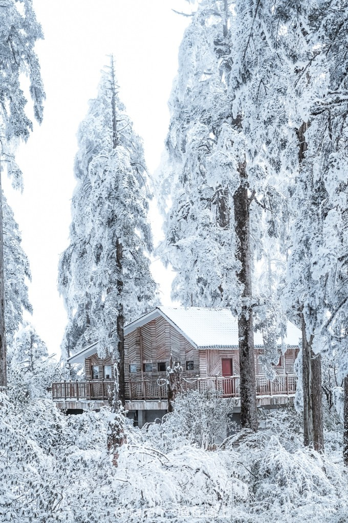 在这片白色世界里,厚厚的积雪妆点高耸入云的冷杉树,