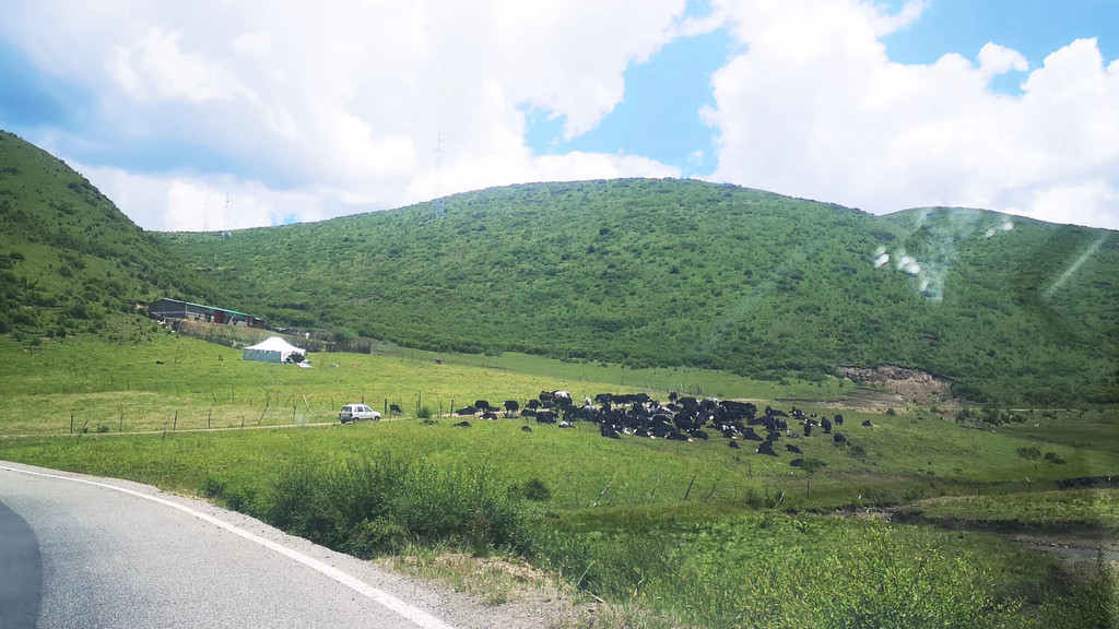 途中“查真梁子”路面海拔3910米,是这次行程中的海拔最高点。翻过以后山势渐缓,视野渐阔,从高山峡谷进入丘陵状高原。